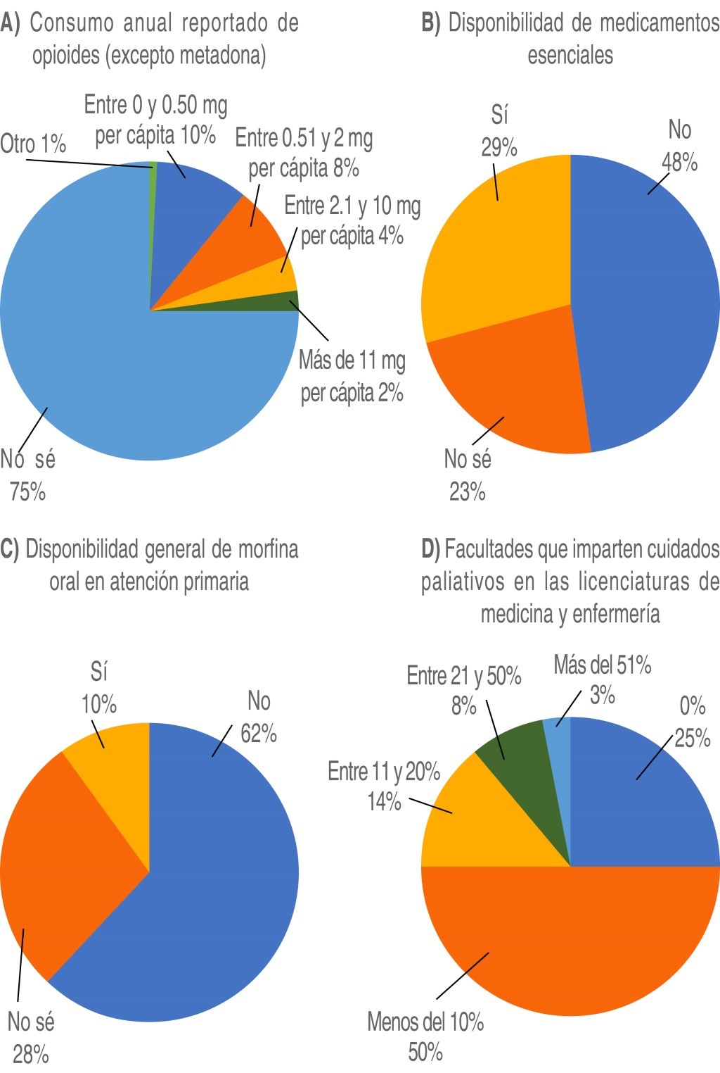 El desconocimiento de dos tercios de los participantes respecto a la disponibilidad de medicamentos esenciales para el alivio del dolor y control de otros síntomas puede indicar, por una parte, la inexistencia de programas de actualización y capacitación en este relevante tema; por otra, escasa disponibilidad de analgésicos opioides y la sobrerregulación existente; que en su conjunto evidencian un control eficaz del dolor en la mayoría de las entidades federativas. Otra barrera común es la complejidad de procesos administrativos y escasez de recursos económicos de los habitantes de áreas rurales que dificultan su movilidad a los distantes puntos de atención ante la carencia rural de estos servicios.