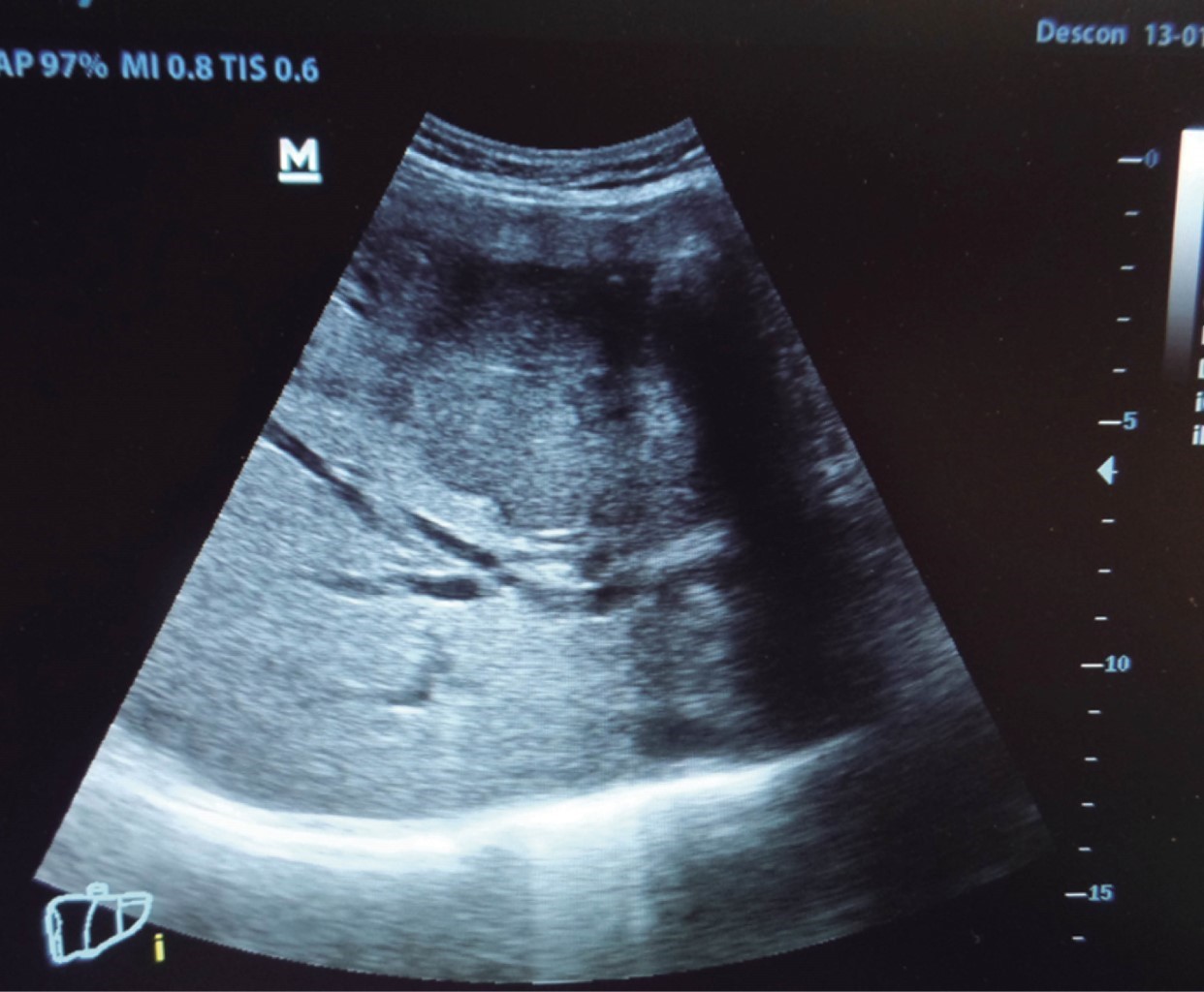 Un hallazgo incidental es cualquier fenómeno indeterminado detectado durante un examen que no tiene relación directa con el síntoma que motivó la exploración, pero que puede tener relevancia clínica que sugiera exámenes o interconsultas complementarios.22 Es para el cirujano general, habituado a recibir pacientes con malestares digestivos, encontrar la abrumadoramente común "distensión abdominal". "Es mi colitis, doctor" dicen los pacientes, y de cuando en cuando hemos encontrado sorpresas de trascendencia vital como tumores renales, una nodulación intravesical que resultó ser un carcinoma de células transicionales (Figura 6), o metástasis hepáticas (Figura 7), aneurismas de la aorta abdominal,23,24 o trombosis de la vena femoral, entre otros. El hallazgo incidental más frecuente en nuestra práctica es el hígado graso,25 que puede ser el detonante de un diagnóstico temprano de un síndrome metabólico y facilitar los exámenes y la orientación clínica pertinente para intervenir con oportunidad en este trastorno endémico. Son comunes los quistes simples, hepáticos o renales. En tales casos se miden su diámetro, se confirma la ausencia de contenido heterogéneo o flujo sanguíneo en su interior (Doppler) y, sobre todo en los renales, que no sustituyan al parénquima renal normal (como en la poliquistosis renal familiar). En ausencia de estas características, se le confirman al paciente como quistes simples y no ameritan mayor intervención. El parénquima hepático puede observarse interrumpido en su ecogenicidad habitual por algún fenómeno anormal como los adenomas o los hemangiomas, que no tienen mayor trascendencia clínica; pero ante cualquier nodulación hepática, debemos registrar la imagen y solicitar una opinión experta, y enviar al paciente al servicio de imagenología y que se protocolice mediante ultrasonido y/o TAC contrastada. Estos hallazgos permitirán profundizar en estudios que confirmen los diagnósticos y reorientar el abordaje terapéutico con una oportunidad que una simple palpación nunca hubiera conseguido y el paciente siempre agradecerá un examen con tal objetividad.