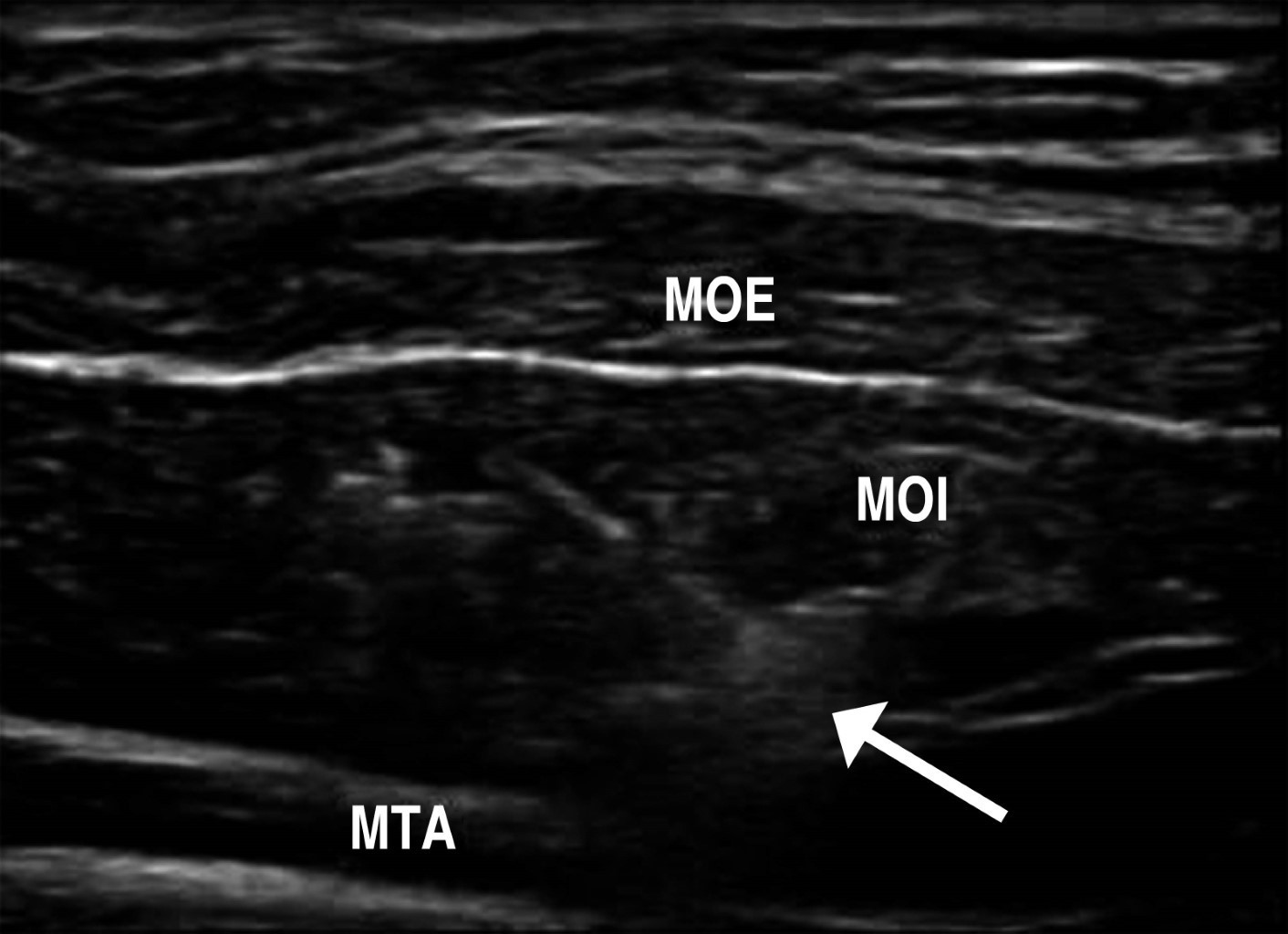 Con ayuda de equipos de ultrasonido portátiles es factible realizar en quirófano bloqueos anestésicos que contribuyen a disminuir el dolor posoperatorio y permitir incluso algunos procedimientos como las plastías inguinales abiertas bajo anestesia local y sedación, las plastías de hernias umbilicales y de la línea media. El bloqueo del plano del transverso abdominal30 se emplea colocando el transductor en el flanco en un plano axial, en el punto medio de la distancia entre la cresta iliaca y el borde costal inferior. Se identifica con el transductor la imagen de los músculos del componente lateral y, empleando una dilución de bupivacaína o ropivacaína, se introduce la aguja bajo guía sonográfica hasta que se identifica la penetración de los dos músculos oblicuos y se infiltra justo entre el oblicuo interno y el músculo transverso abdominales (Figura 8). Este procedimiento produce un bloqueo que puede abarcar desde los dermatomas T9 al L1. Su principal utilidad es la disminución del dolor posoperatorio y, por lo tanto, puede aplicarse en toda cirugía abdominal. Adicionalmente, para un mayor efecto analgésico/anestésico, se realiza un bloqueo de la vaina de los rectos, colocando el transductor en sentido axial a nivel del epigastrio, en el borde lateral de cada músculo recto y se infiltra delante de la vaina aponeurótica posterior. La combinación bilateral de estos dos procedimientos (bloqueo del plano transverso y de la vaina de los rectos bilateral) puede emplearse en toda cirugía abdominal, lo que reduce significativamente el dolor posoperatorio. En las plastias inguinales abiertas se emplea el bloqueo de los nervios ilioinguinal e iliohipogástrico, más anestesia local en el sitio de la incisión. Todos estos procedimientos pueden también utilizarse en el consultorio, para tratar dolores inguinales o de pared abdominal, en casos de pacientes con problemas de dolor crónico posoperatorio o con lesiones deportivas, combinando el anestésico local con agua inyectable y un esteroide de depósito como, por ejemplo, 5 mg de betametasona. Pueden beneficiarse de bloqueos repetidos con intervalos de 15 días (sin repetir necesariamente el esteroide combinado en cada bloqueo). Tratándose de la infiltración de la toxina botulínica, como parte de una preparación preoperatoria de hernia compleja,31 se aplica la misma técnica de guía sonográfica en el plano axial del flanco abdominal para inyectar la toxina, bajo visión directa de los músculos del componente lateral del abdomen. En ese caso empleamos la guía con ultrasonido, aplicando cinco punciones por flanco, para asegurar que se deposite la toxina mayormente a nivel del músculo oblicuo interno.