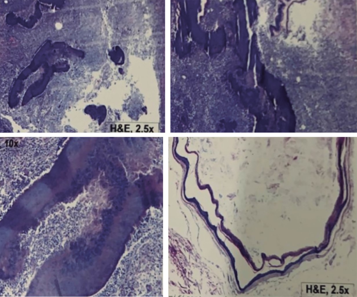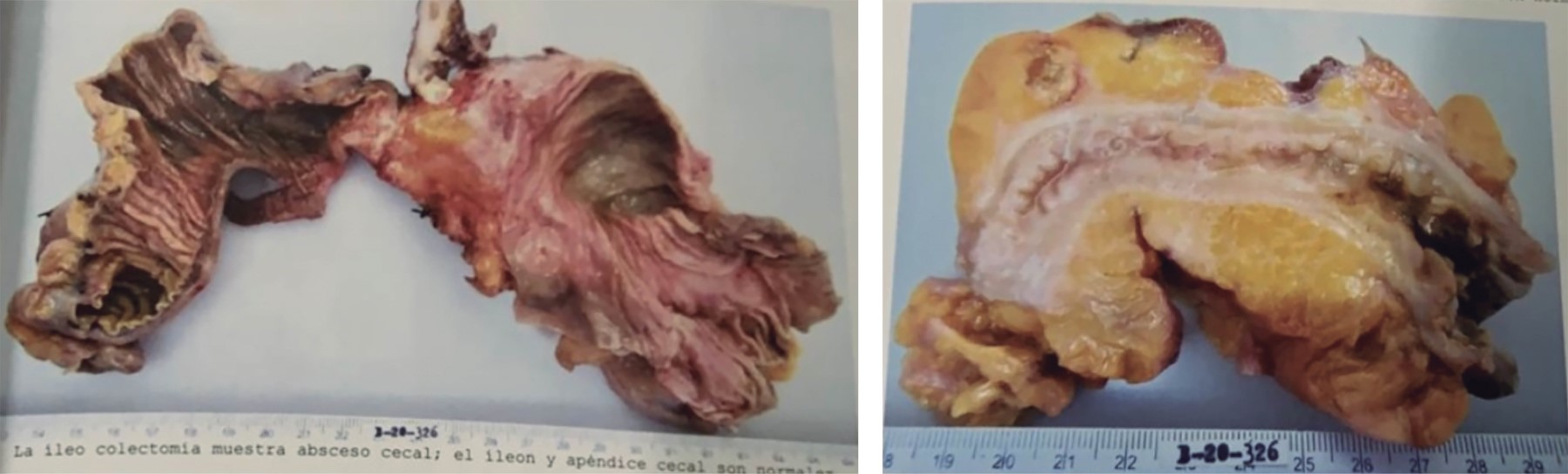 Paciente femenina de 66 años con antecedente personal de importancia de diabetes tipo 2, de 40 años de evolución, tratada con insulina, así como hipertensión arterial sistémica, de 25 años de evolución, tratada con IECA; antecedente quirúrgico de reparación de hernia umbilical hace 14 años, cesárea hace 34 años y fractura de clavícula hace dos años. Es admitida al servicio de urgencias por presentar dolor abdominal localizado en la fosa iliaca derecha, el dolor abdominal era crónico, con más de seis meses de evolución; lo había presentado pero había cedido. La semana anterior comenzó con dolor abdominal localizado en fosa iliaca derecha el cual cedía con medicamentos, asimismo síntomas de oclusión intestinal sin poder canalizar gases y no presentó vómito. A la exploración se encontró taquicardia, irritación peritoneal en fosa iliaca derecha, tumoración palpable en fosa iliaca derecha de alrededor de 7 × 10 cm y peristaltismo muy disminuido. Se le realizó una tomografía abdominal (Figuras 1 y 2) donde se observó una tumoración que se encontraba con probable perforación, lo mencionan como probable apendicitis complicada vs tumoración. Se decide realizar laparotomía exploradora encontrando líquido de reacción inflamatorio no purulento de aproximadamente 100 cc, se observa tumoración que depende del ciego tomando sigmoides, por lo que se decide practicar hemicolectomía derecha con ileostomía y cierre de cabo distal, así también se realiza resección del sigmoides de alrededor de 7 cm, realizando anastomosis de sigmoides término-terminal con técnica manual con sutura no reabsorbible. Se colocan drenajes cerrados hacia corredera derecha y drenaje cerrado a hueco pélvico. Se extraen piezas de patología y se envían. Se termina el procedimiento quirúrgico, pasa a recuperación y posteriormente a piso, se le indica ayuno por 24 horas y comenzamos con dieta enteral. La evolución es hacia la mejoría clínica, comienza gasto por estoma, siete días posterior a la cirugía se retiran los drenajes sin complicaciones, se refiere a servicio de Infectología quien da ciclo de antibiótico a base de tetraciclinas por seis semanas. El reporte de patología demuestra región de hemicolectomía (Figura 3) sin alteraciones del tejido linfoide en placas de Peyer, en la serosa se encuentran depositadas pseudomembranas de fibrina con neutrófilos. La válvula ileocecal y mucosa cecoascendente demuestran reacción inflamatoria mixta con numerosos piocitos que se extienden al tejido adiposo del mesoapéndice que alberga colonias bacterianas de Actinomyces spp. que conforman filamentos ramificantes y coronas radiales formando gránulos de azufre (Figura 4). El apéndice cecal demuestra periapendicitis aguda fibrinopurulenta y el tejido de sigmoides con pronunciado edema en sus paredes. Diagnóstico: Actinomyces invasor cecal, perforado con peritonitis aguda fibrinopurulenta secundaria. La paciente es vista en servicio de consulta externa de cirugía general con evolución favorable. Infectología recomienda esperar por lo menos seis meses libres de actividad inflamatoria y de tratamiento médico con antibiótico para planear la reconexión intestinal.