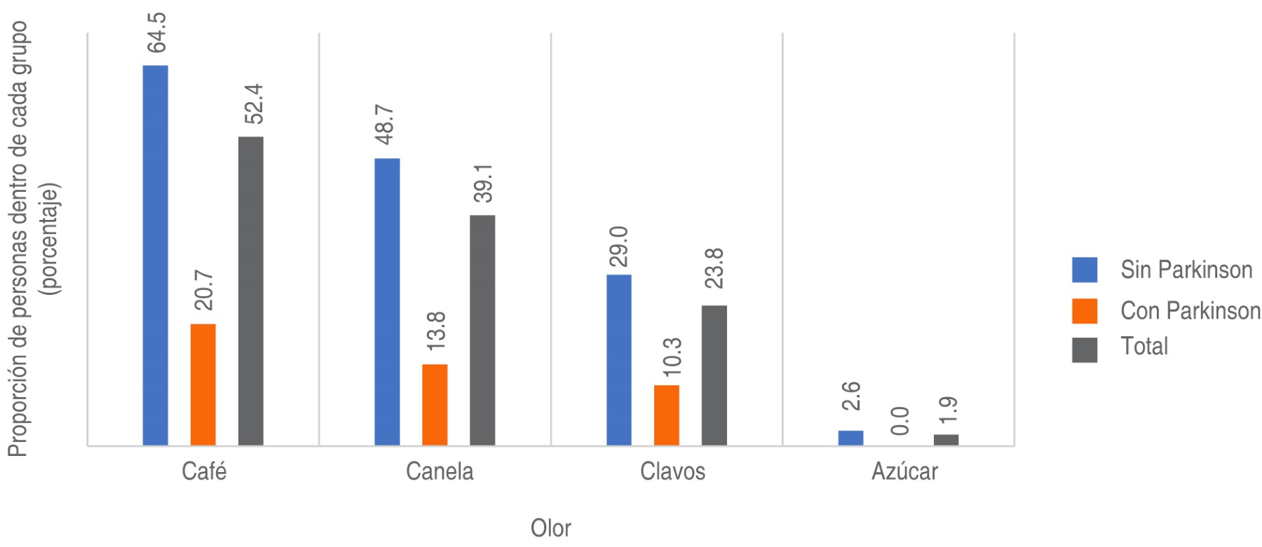 En este estudio se decidió comparar la percepción de estos olores entre individuos con y sin EP, encontrando que la mayoría identificaron el café, seguido por la canela, los clavos y una detección del azúcar despreciable. Siendo estos hallazgos consistentes con los reportados por la doctora Robledo y colaboradores en los que el café y la canela fueron las fragancias más identificadas.