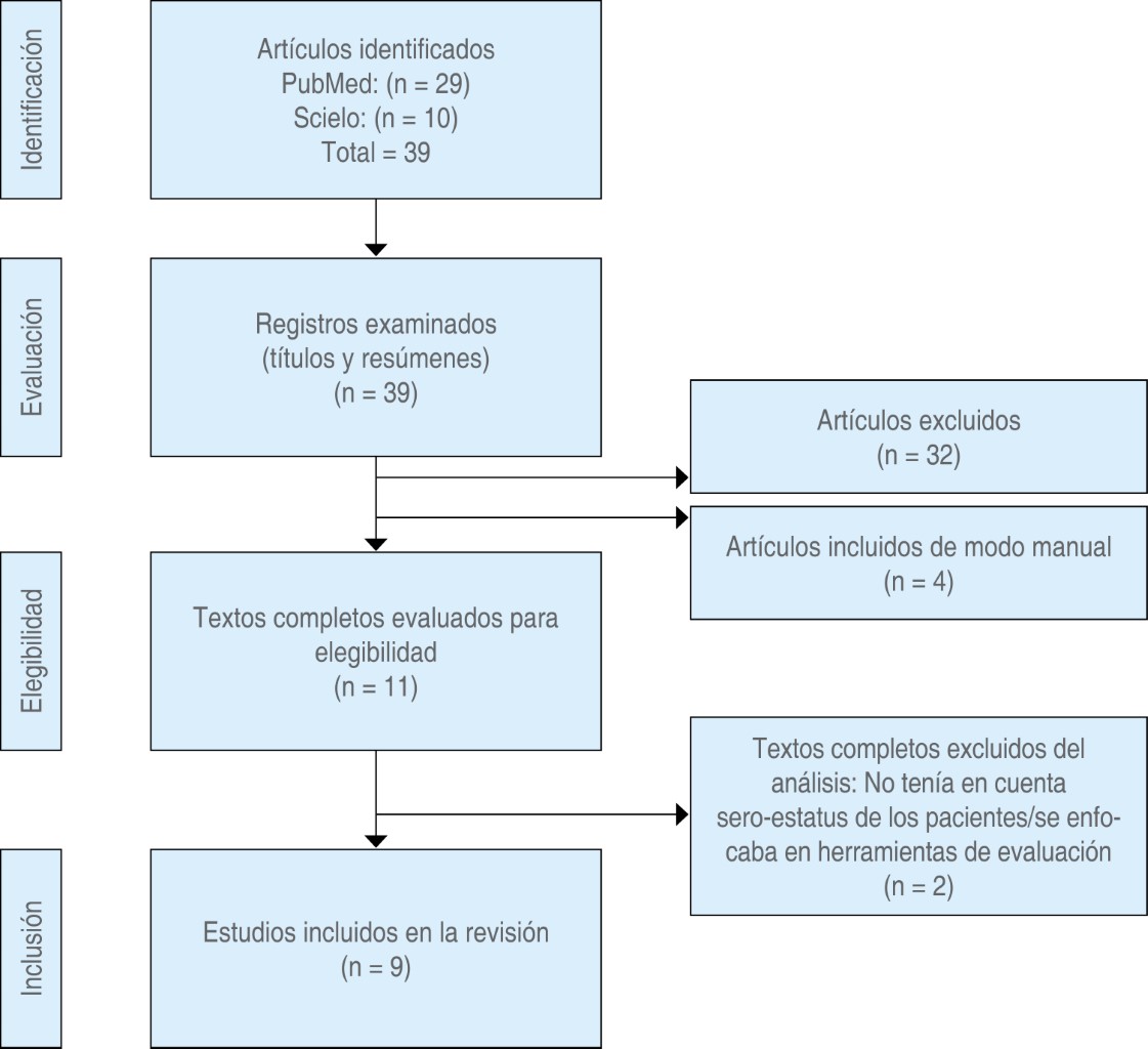 Al aplicar los criterios de inclusión, siete estudios cumplieron de inició los requisitos, después se adicionaron cuatro artículos a partir de referencias bibliográficas extraídas de los artículos evaluados al inicio. Luego de una evaluación total de contenido, se descartaron dos textos más por tener un enfoque diferente orientado al estudio de herramientas de evaluación o sin dar importancia al sero-estatus de los participantes. La Figura 1 resume la metodología de selección de resultados de la búsqueda.