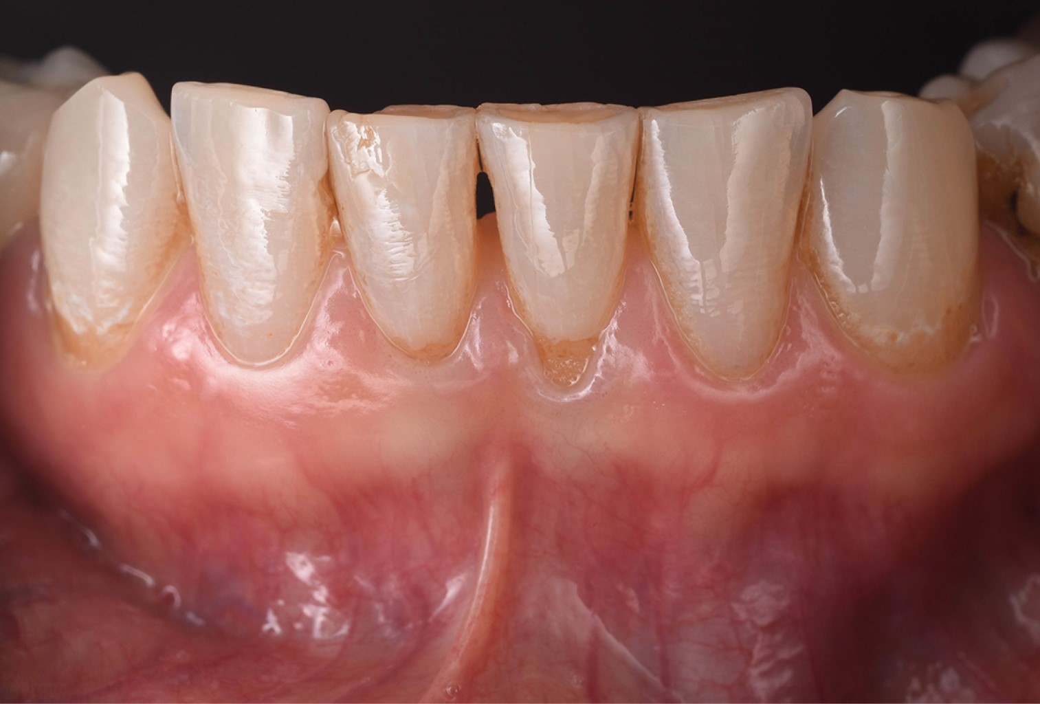 Paciente femenino de 60 años, acude a la Especialidad de Periodoncia de la Universidad Autónoma de Baja California, se diagnostica con salud gingival y periodontal en un periodonto reducido (Figura 1), paciente no periodontal. Asociado a un trauma oclusal primario, con un grosor de 0.8 mm (fenotipo delgado) y RT1 en órgano dentario 24.