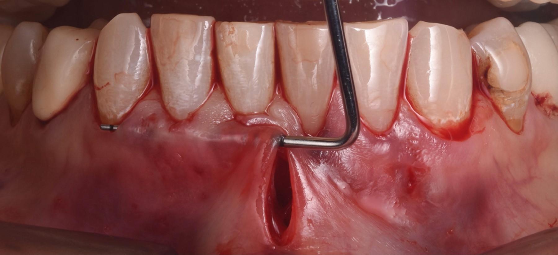Se emplea la técnica VISTA para realizar el abordaje quirúrgico, en región anteroinferior mandibular se realizó incisión con hoja de bisturí 15C, se observó que realizar la incisión a nivel del frenillo permite disimular la cicatriz. La elaboración del túnel se realizó por medio de tunelizadores (TKN1 y TKN2) con extensión hacia caninos de ambos lados, liberando el colgajo (Figuras 2 y 3).