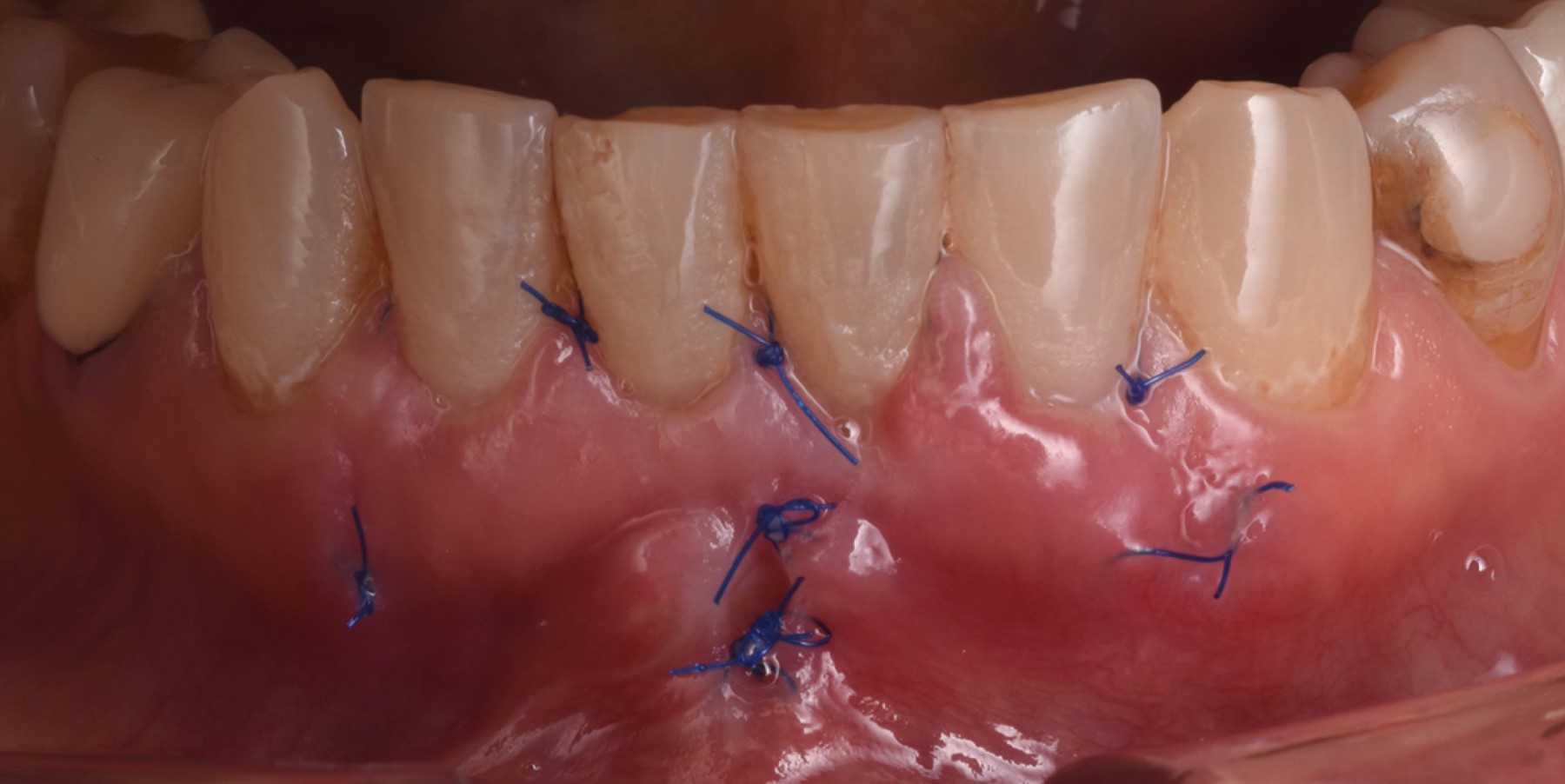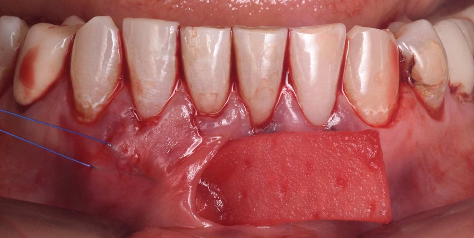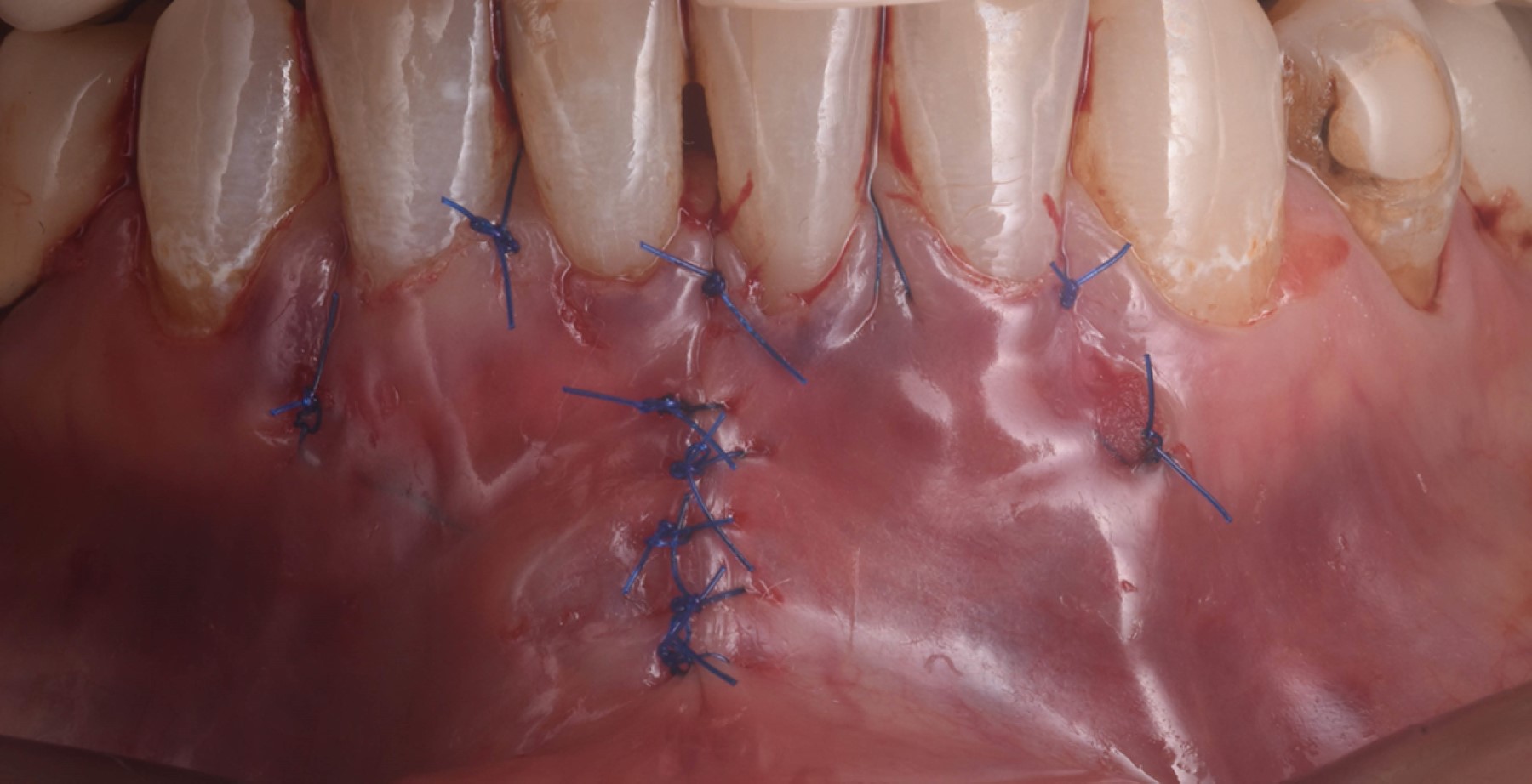 Por otro lado, se utilizó matriz dérmica acelular de origen porcino debido al rechazo de la paciente por tener dos sitios quirúrgicos; analizando el procedimiento, Tavelli, en 2019, menciona las bondades de utilizar dicho material: disminuye el tiempo quirúrgico, acepta la preferencia del paciente al contemplar la biocompatibilidad del biomaterial a utilizar, la matriz dérmica acelular xenogénica (porcino) promueve el crecimiento de fibroblastos y células endoteliales y su principal indicación es la cobertura radicular y el aumento de espesor gingival.9