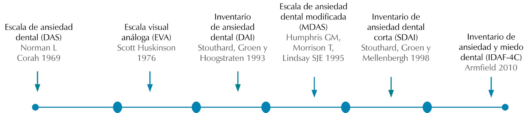 La ansiedad dental se define como una respuesta emocional exagerada y/o desmedida con sentimientos de aprensión, rechazo, nerviosismo, miedo, etcétera, ante un estímulo específico del entorno odontológico (personal, agujas, sonido de pieza de mano, olores, tratamientos) que el paciente percibe como amenazante, de un recuerdo doloroso del pasado o una situación que aún no ocurre, pero imagina.1,2 Su etiología es compleja y puede deberse al tratamiento dental específico, pero interactúa también con otros factores como el consultorio odontológico, el instrumental, la sala de espera, la actitud del odontólogo y el personal, o bien, experiencias previas. Se reportan prevalencias muy dispares en varios países del mundo, por ejemplo en la India, China e Irán, los porcentajes de ansiedad dental oscilan entre 46 hasta 77.4%, mientras que en Latinoamérica se notifican valores de 62.8% para Colombia, Perú con 96.06% y en México se reportan porcentajes desde 79.8% hasta 100% de la población encuestada que presentaron algún grado de ansiedad dental.1,3-5 En la gran mayoría condicionado al género femenino6,7 y que disminuye progresivamente con la edad.8 Para medir el diagnóstico de ansiedad dental existen diferentes escalas o instrumentos de evaluación (Figura 1) y de los diversos estudios, muchos se han realizado en la práctica institucional (hospitales y clínicas del estado o clínicas de formación universitaria) y pocos en práctica privada, de ahí su discrepancia. Identificar el nivel de ansiedad puede ayudar a diseñar estrategias encaminadas a disminuir la ansiedad dental, facilitando la adherencia a los tratamientos y por ende optimizar la salud bucal de nuestros pacientes, por lo cual el presente estudio tuvo como objetivo determinar el nivel de ansiedad dental en pacientes adultos que acuden a consultorios privados en Texcoco, Estado de México, e identificar los factores detonantes.