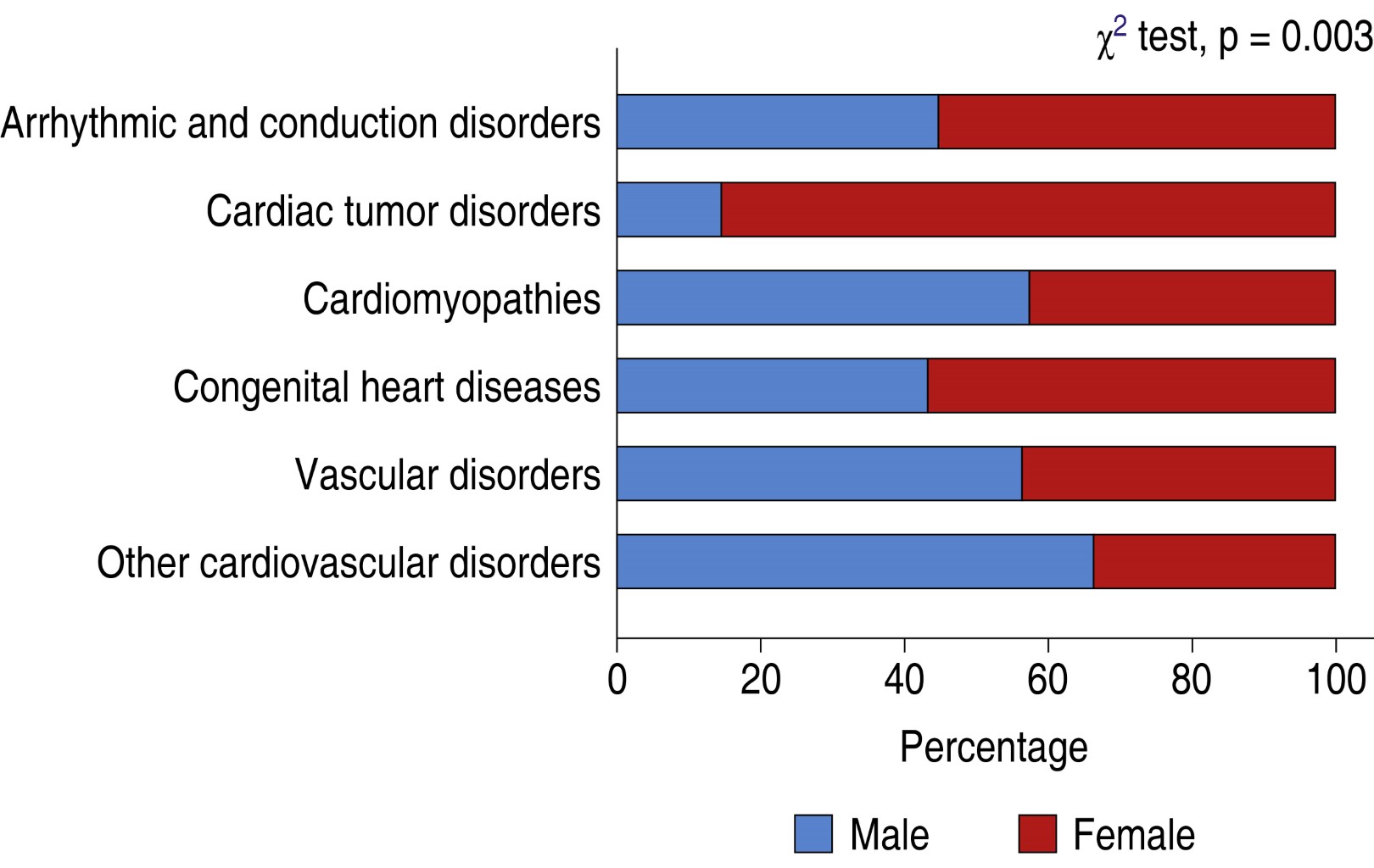 Resultados: las ECVGR comprendieron 794 de 31,487 pacientes de la consulta externa, correspondiendo a 104 enfermedades. La prevalencia global de ECVGR fue de 2.5% (IC95%, 2.3-2.7) de los pacientes. La prevalencia de los trastornos monogénicos y cromosómicos fue de 2.1 y 0.4%, respectivamente. Las cardiopatías congénitas fueron el fenotipo cardiovascular más frecuente (42.4%), y los menos frecuentes fueron los trastornos tumorales cardiacos (0.9%).