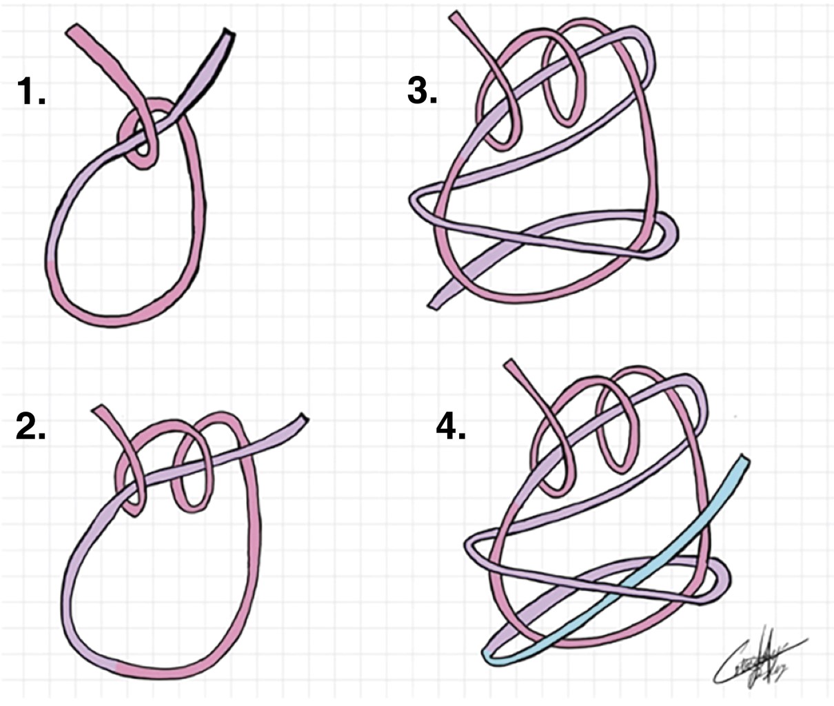 Nuestra hipótesis basada en la experiencia de su uso, es que el nudo H. Juárez (se explica su elaboración en la Figura 2) es resistente, no se desliza y es fácilmente realizable, por lo que se puede usar con seguridad en cirugía laparoscópica.