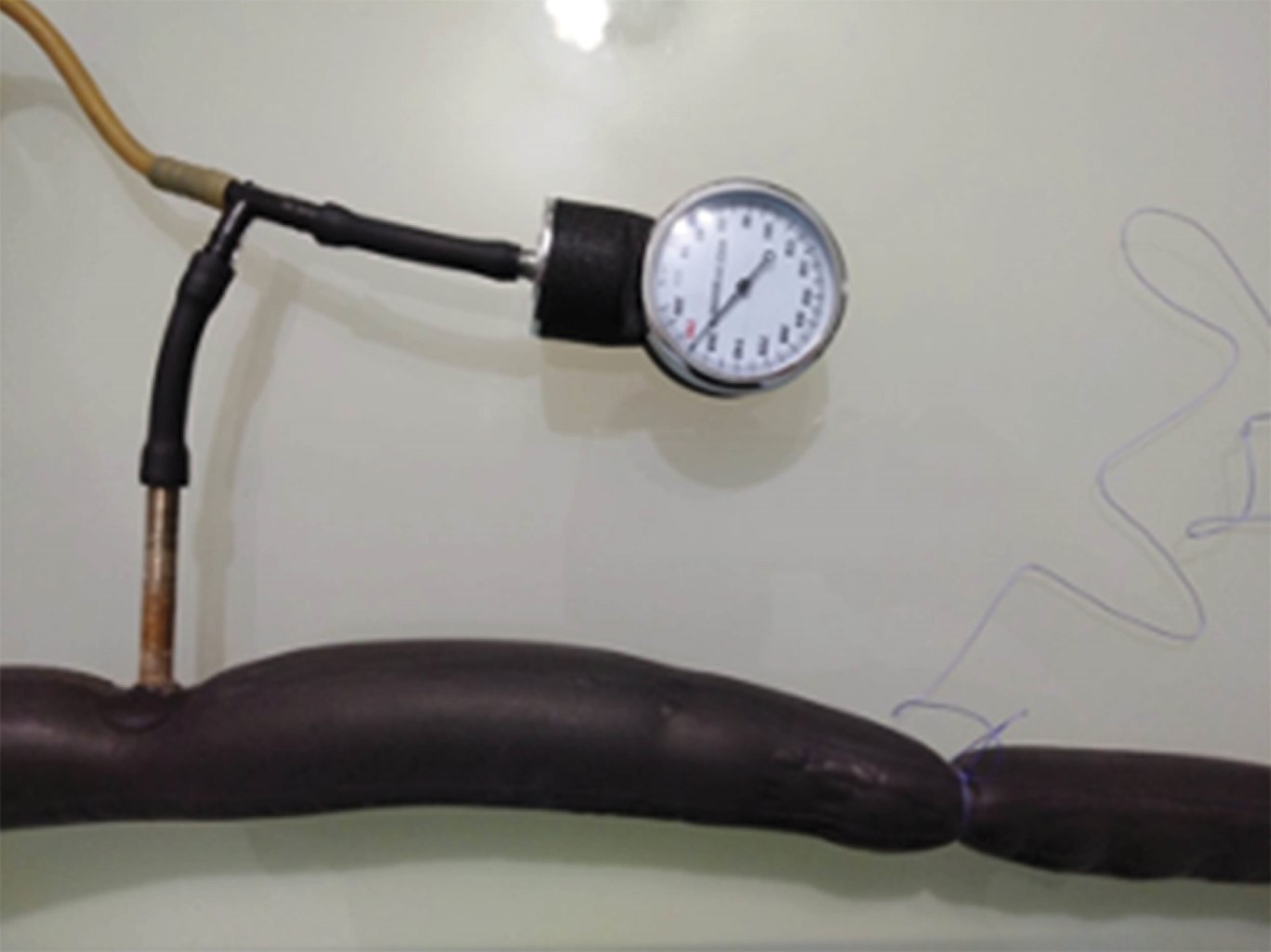 Se efectuaron pruebas físicas para comprobar la hipótesis. Mediante un dispositivo de presión neumática (Figura 3) se realizó el nudo H. Juárez alrededor del caucho y se insufló hasta 300 mmHg. Se observó si el nudo se deslizaba, rompía o no se modificaba, probando los materiales prolene, ácido poliglicólico y catgut crómico, en calibre del 000, esto 50 veces con cada material. Se registró cada prueba anotando los cambios sufridos.
