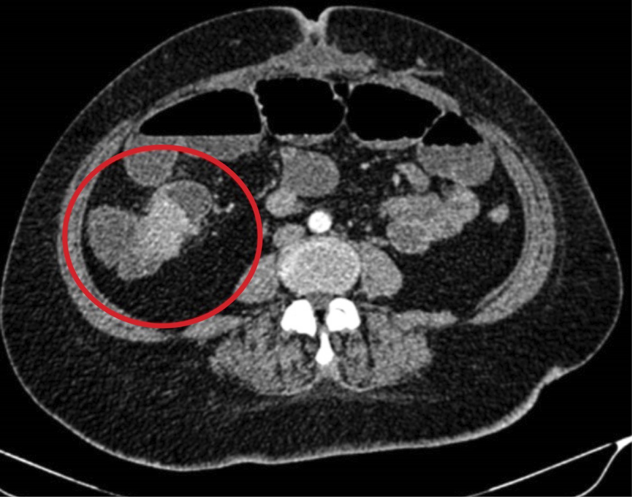 Se trata de paciente femenino de 43 años, que refiere hipertensión arterial sistémica, y como antecedentes quirúrgicos plastia umbilical. Acudió al servicio de urgencias por referir cuadro de tres semanas de evolución con dolor abdominal generalizado de intensidad 10/10 en la escala visual análoga (EVA), acompañado de vómito, intolerancia a la vía oral, dificultad para evacuar y canalizar gases.