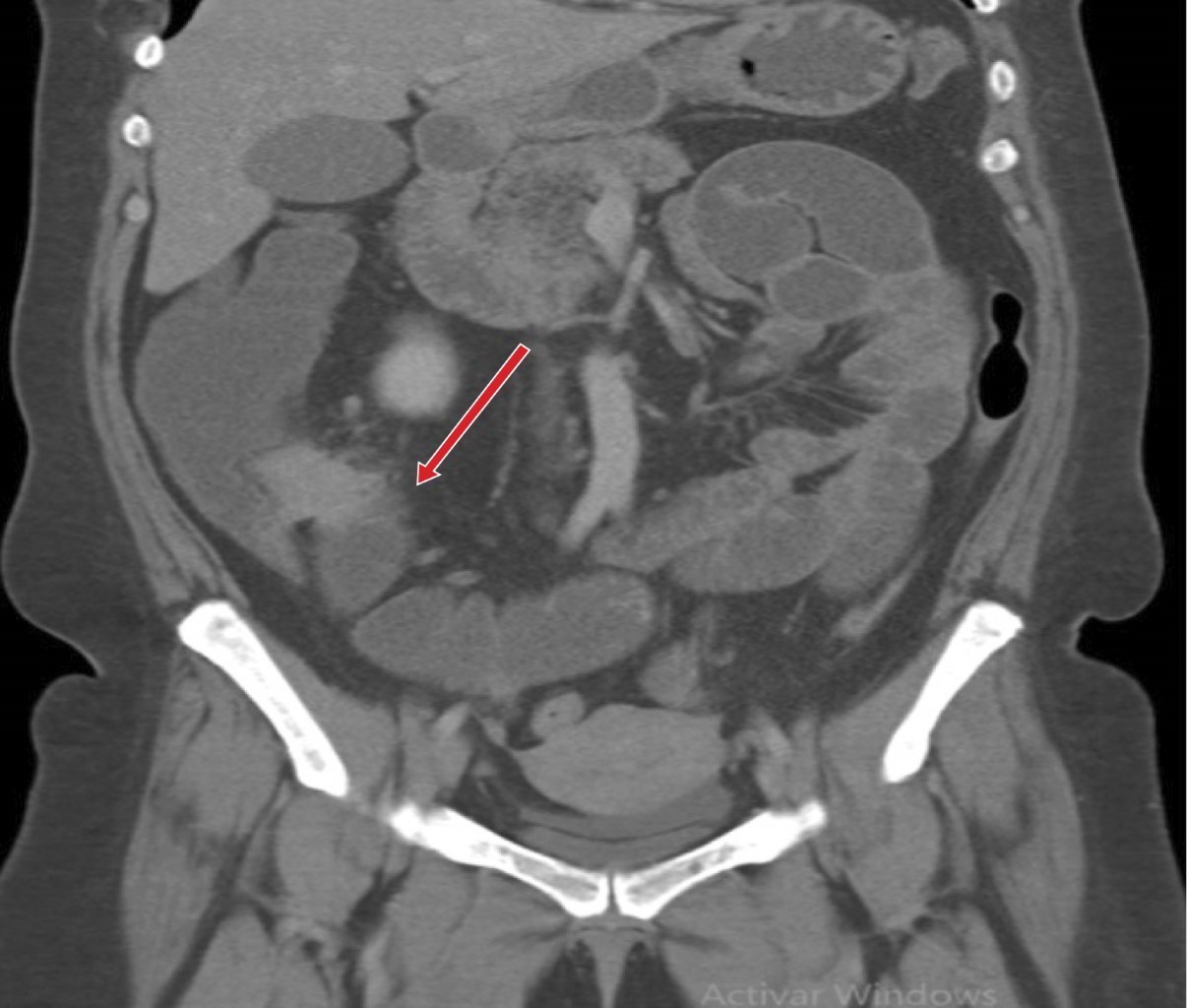 Se inició abordaje diagnóstico, se realizaron estudios de laboratorio y se obtuvieron cifras de leucocitos 9.08 × 103/mm3, hemoglobina 8.9 mg/dL, plaquetas 408 × 103/mm3, proteína C reactiva 42.4 mg/L. Se complementó el abordaje con estudios de gabinete, se inició con radiografías de abdomen, observando datos de oclusión intestinal tales como múltiples niveles hidroaéreos y ausencia de gas distal. Ante tales hallazgos, se decidió realizar tomografía de abdomen, la cual reportó obstrucción intestinal, sin descartar origen neoplásico con ganglios centinelas mesentéricos (Figuras 1 y 2).