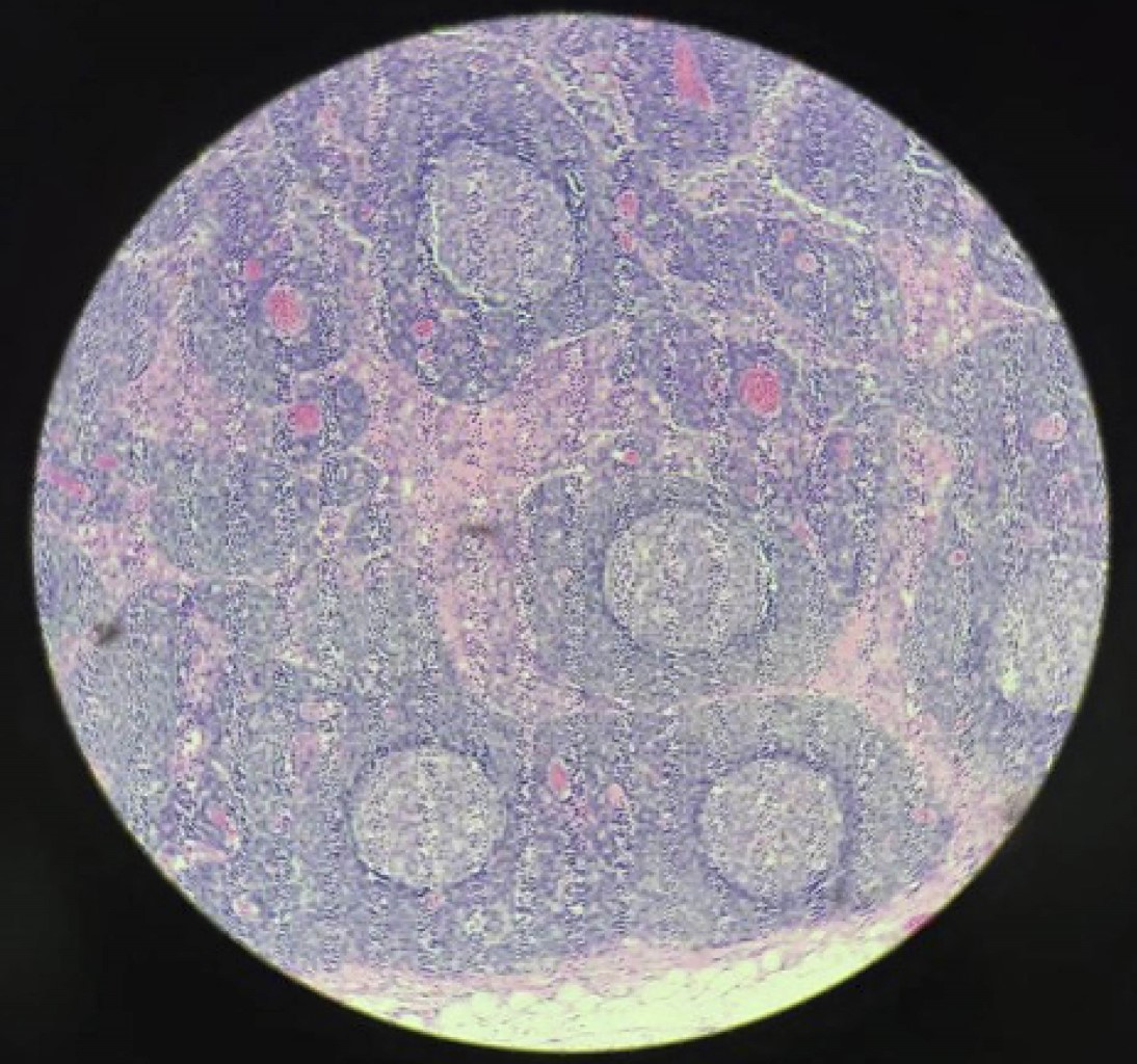El reporte anatomopatológico definitivo fue concluyente para apendicitis incipiente, bazo accesorio con acentuada congestión de 4 cm de diámetro, localizado en mesocolon de región pericecal (Figura 4). Íleon con congestión de la submucosa. Seis ganglios linfáticos con acentuada congestión.