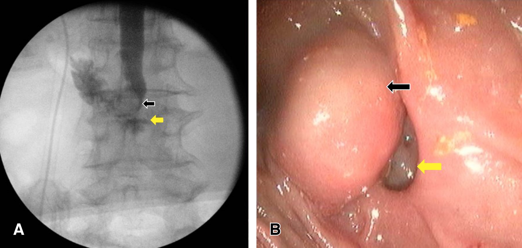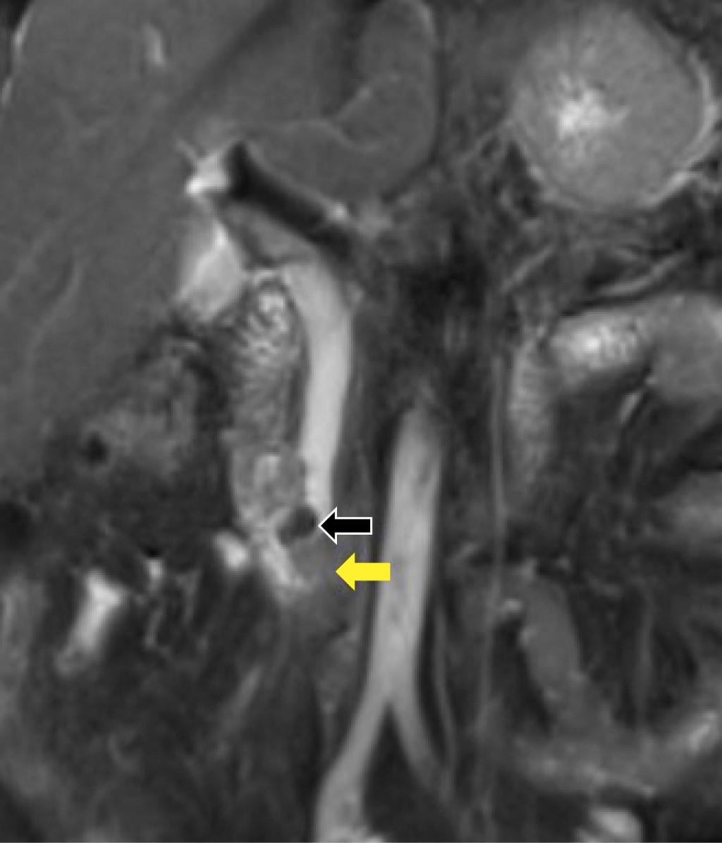 El diagnóstico de DDY comúnmente es incidental; sin embargo, no debe olvidarse, y debe tomarse como diagnóstico diferencial como causa de dolor abdominal intermitente. Las pruebas de imagen como tomografía y resonancia magnética son esenciales, mismas que muestran una cavidad de pared delgada en la segunda porción del duodeno (Figura 1), confundida a menudo con absceso pancreático o neoplasia quística de la cabeza del páncreas. El ultrasonido endoscópico es útil para descartar neoplasias; no obstante, la CPRE continúa siendo el estándar de oro diagnóstico-terapéutico, con tasas superiores de éxito de 95% y recurrencia de 10-24%.1,5,12