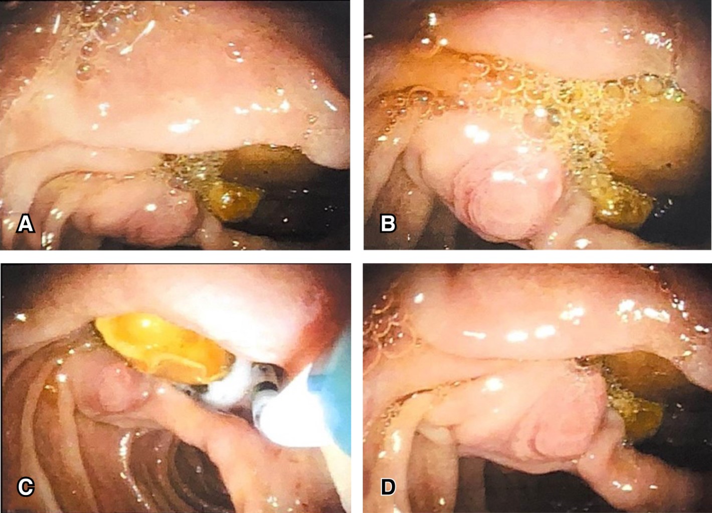 Segundo caso clínico. Paciente femenino de 86 años con cuadro de dolor abdominal intermitente en epigastrio y mesogastrio de larga evolución, con sensación de plenitud gástrica, sin otra sintomatología agregada, recibió diversos tratamientos por síntomas de gastroenteritis y enfermedad ácido-péptica, pero fueron ineficaces. Durante su abordaje diagnóstico sin ictericia, signo de Murphy y puntos pancreáticos negativos, con dolor abdominal a la palpación profunda en hipocondrio derecho y mesogastrio; paraclínicos dentro de parámetros normales. El ultrasonido mostró dilatación de vías biliares intrahepáticas y colédoco de 12 mm, sin evidencia de litiasis vesicular ni en colédoco. Se realizó duodenoscopía y CPRE encontrando DDY de 3 cm aproximadamente con restos alimenticios abundantes en su interior, los cuales se retiraron bajo lavado con solución estéril (Figura 3). El procedimiento se llevó a cabo sin complicaciones, paraclínicos sin anormalidades; se egresó y se dio seguimiento consecutivo con duodenoscopía, evidenciando DDY sin restos alimenticios ni datos de inflamación.
