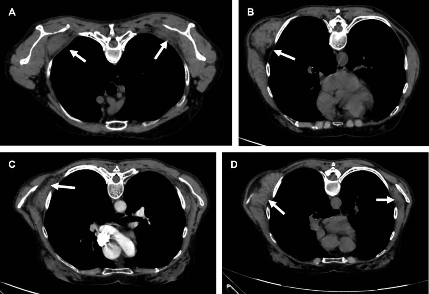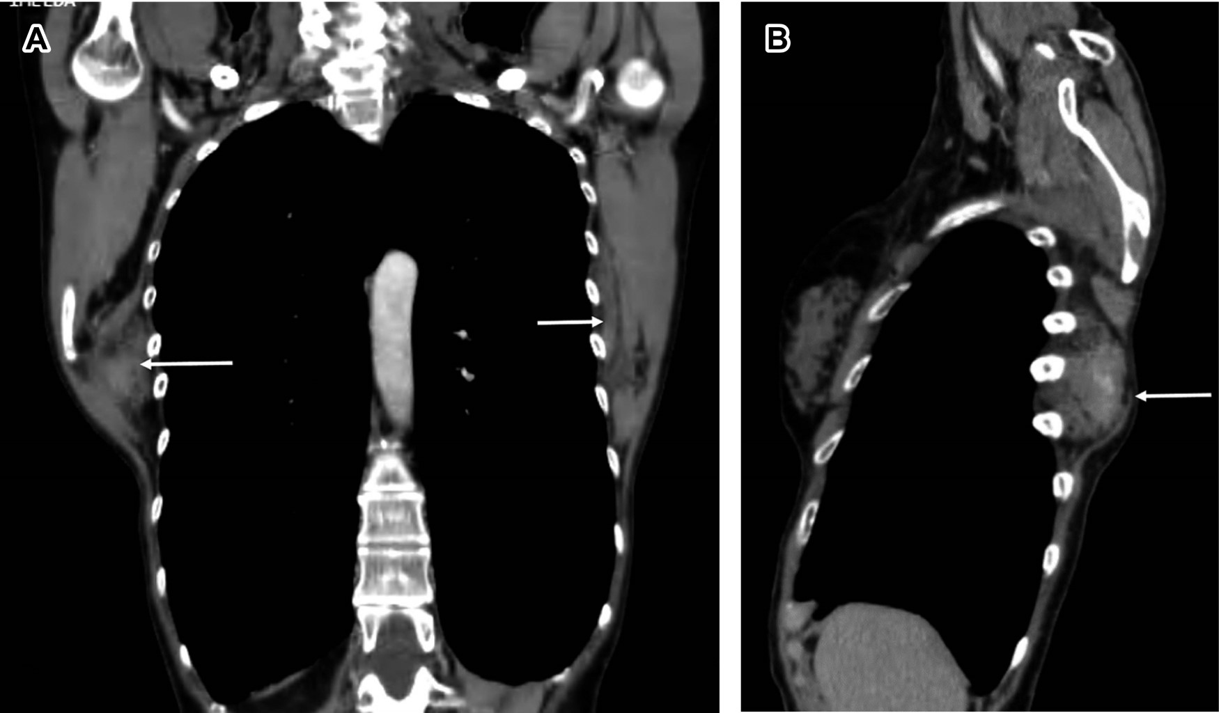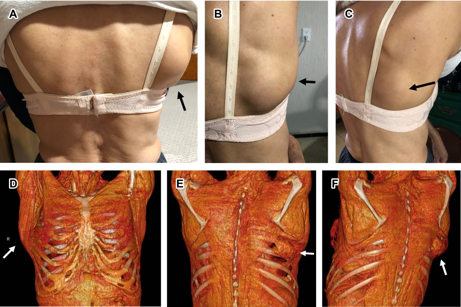Paciente femenino de 60 años, ama de casa, acude por presentar abultamiento de cinco años de evolución en región escapular derecha, que le ocasiona discreta molestia al efectuar limpieza en el hogar. A la exploración se observa masa de consistencia ahulada en ángulo inferior de escápula derecha prominente, con dimensiones de 7 × 5 cm (Figura 1A-C), no dolorosa al movimiento, con sensación de frote a los desplazamientos de ambas escápulas, con arcos de movilidad de hombros completos y sensibilidad normal; el resto de la exploración es normal. Con diagnóstico presuntivo de elastofibroma dorsi. Se solicita tomografía computarizada (Figuras 1, 2 y 3) que confirma elastofibromas dorsi bilaterales; se propone cirugía, la cual rechaza.