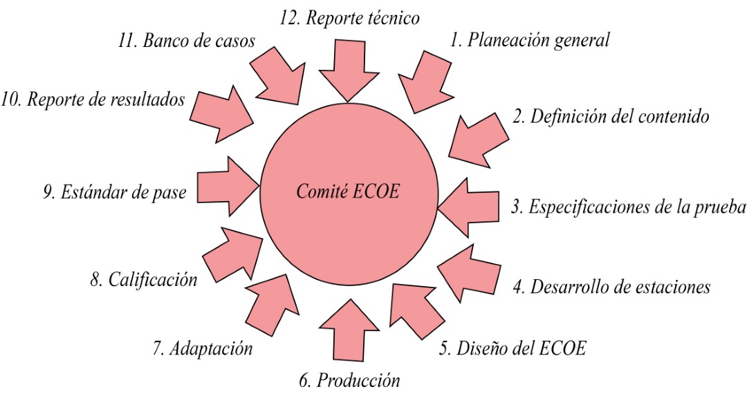 Una forma de evaluar las habilidades y destrezas que el alumno adquiere en un escenario es por medio de estaciones basadas en casos clínicos, previamente, es necesario crear una tabla de especificaciones y una matriz de contenidos, donde se delimitarán las áreas, los conocimientos, habilidades y actitudes que se evaluarán.5,6 Existen dos tipos de estaciones: de procedimientos y de interpretación de estudios de laboratorio y gabinete. Las estaciones de procedimientos pueden ser: 1) interrogatorio; 2) exploración física; 3) diagnóstico y manejo; y 4) habilidades técnicas (tales como aplicación de DIU o toma de Papanicolaou, en las que se emplea un maniquí).7 En cada escenario se entrena a actores para recrear los escenarios planeados, y al final también participan en el proceso de retroalimentación.8 El Examen Clínico Objetivo Estructurado (ECOE) simula un encuentro clínico mediante la representación ficticia de un paciente con un padecimiento predeterminado.6 Es formativo cuando el estudiante recibe realimentación del desarrollo de su competencia lo que le ayuda a conocer las fortalezas y debilidades durante el proceso de formación,9 sumativo cuando permite establecer si los estudiantes alcanzaron un estándar aceptable de competencia clínica para avanzar por las diferentes etapas de su proceso formativo y diagnóstico, al identificar las fortalezas y debilidades de los estudiantes al inicio de un nivel educativo se puede adecuar la enseñanza y el aprendizaje.10 También se ha utilizado en otras disciplinas como en Derecho, Sociología, Trabajo Social, entre otras.11-13 Es necesario seleccionar un instrumento de evaluación (rúbrica o lista de cotejo) que nos permita conocer el nivel de desempeño de cada sustentante, con los indicadores que se pretenden evaluar y que correspondan con los objetivos planteados.14 En ocasiones se puede realizar un ECOE a distancia, como en pandemia ocasionada por SARS-CoV-2; la planeación en este caso es igual a la de un ECOE presencial. Los atributos centrales que se pueden evaluar son: las habilidades de comunicación oral y escrita, habilidades prácticas, de diagnóstico, tratamiento y profesionalismo, las habilidades prácticas tienen gran dificultad para ser evaluadas en esta modalidad; aún con esta limitante existe experiencia por quienes los han llevado a cabo a nivel internacional e incluso en México en donde se le ha dado el nombre de Web ECOE.15-17 En cuanto al análisis de los resultados, se debe considerar la medición de la confiabilidad para estimar la validez interna del examen aplicado, esto quiere decir, estimar la reproductibilidad del examen a lo largo del tiempo mediante un modelo de efectos aleatorios que permite obtener los estimadores de los componentes de la varianza para cada variable que haya sido considerada.18 Para llevar a cabo un ECOE se debe conformar un comité (Figura 1)19 que incluya la participación de médicos con experiencia clínica, deben estar capacitados en este método de evaluación y haber participado en al menos tres experiencias de evaluación previas con esta estrategia en calidad de evaluadores y en la elaboración de las estaciones al nivel de solución de problemas más frecuentes para el médico general.20MATERIAL Y MéTODOS