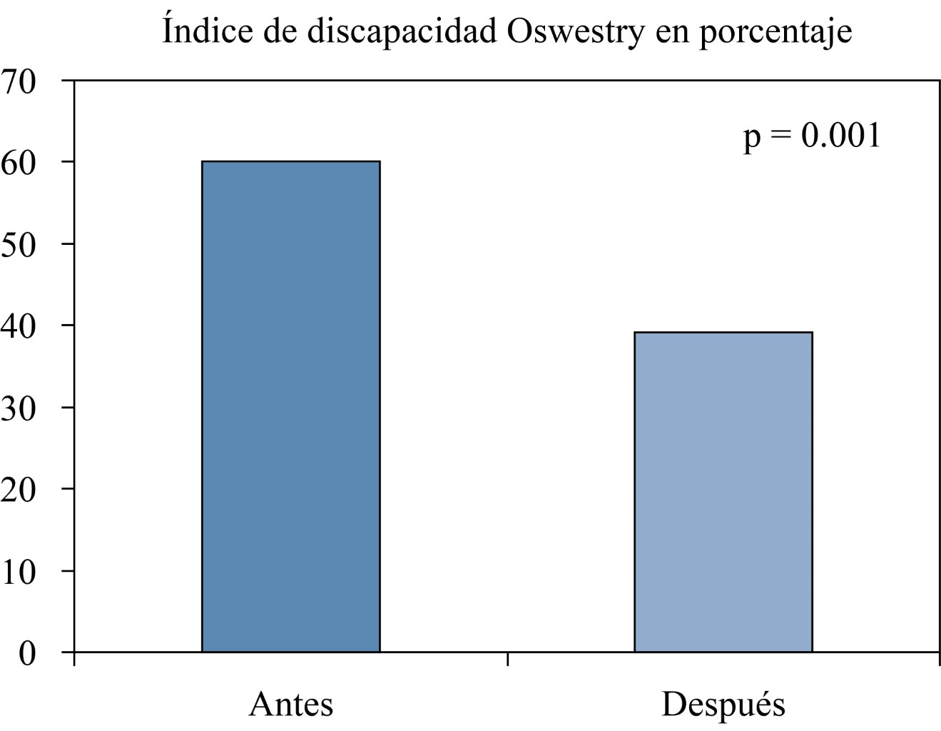 Los resultados de la valoración inicial mostraron 30% de discapacidad en la escala de discapacidad de Oswestry; en los resultados de la evaluación posterior al entrenamiento se presentó 19.64% discapacidad con una mejoría estadísticamente significativa de p = 0.001 (Figura 1).