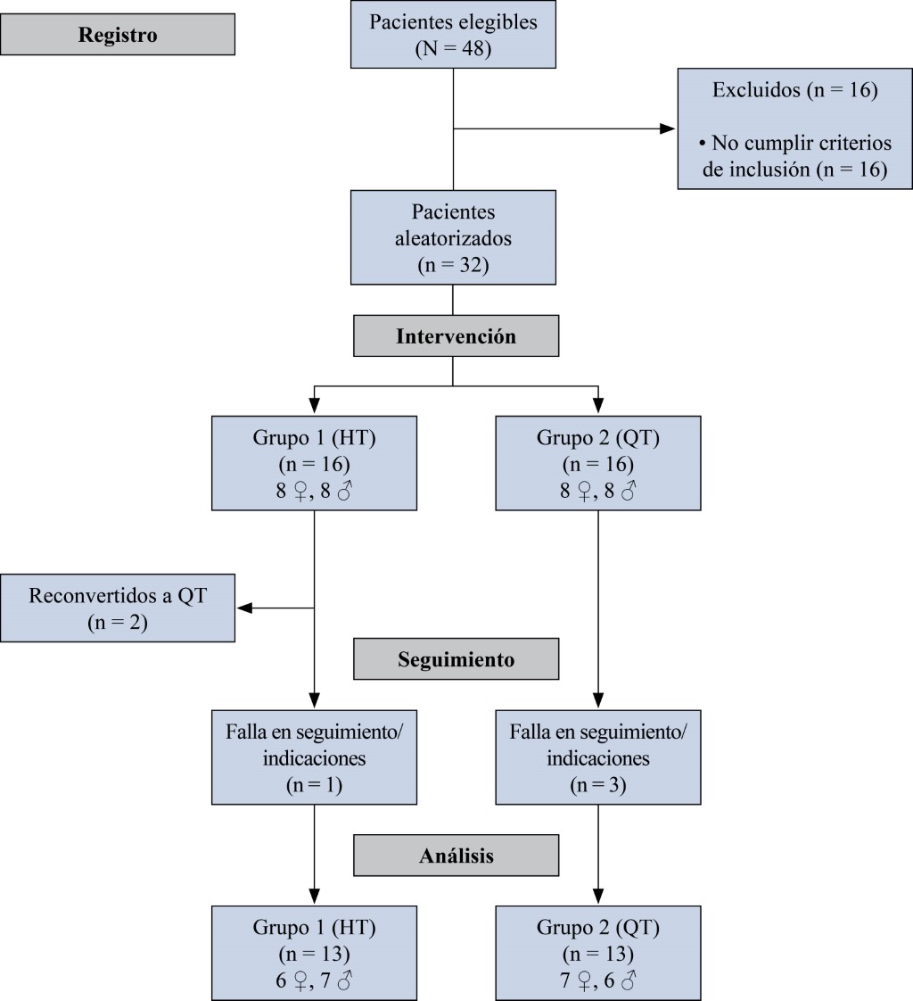 De dichos pacientes, dos pertenecientes al grupo 1 requirieron reconversión del procedimiento a la toma de QT por insuficiencia en el tamaño del injerto obtenido del HT, los cuales fueron descartados del estudio; otro paciente del mismo grupo no asistió a sesiones de fisioterapia ni consultas de evaluación posteriores, por lo que de igual manera fue descartado. En el grupo 2, tres pacientes no acudieron a las consultad de 30, 180 y 360 días, por lo cual fueron descartadas del estudio. Trece pacientes del grupo 1 (seis mujeres y siete hombres) y 13 del grupo 2 (siete mujeres y seis hombres) cumplieron en su totalidad con los requerimientos para ser considerados en el análisis posterior del estudio.