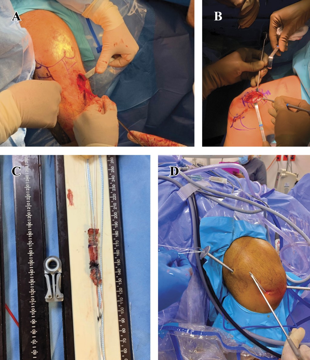 La toma del injerto de isquiotibial se realizó por medio de la incisión en la región inferolateral de la articulación, con posterior disección por planos y la toma con tenótomo del tendón semitendinoso, posteriormente cerrando por planos la incisión (Figura 2A); por otro lado, el tendón del cuádriceps fue obtenido con una incisión longitudinal en la región superomedial de la articulación y rótula, disecando por planos, exponiendo el tendón e incidiendo con bisturí, obteniendo con apoyo de equipo de radiofrecuencia medida de injerto aproximadas de 10 mm de diámetro por 6.5 cm de largo (Figura 2B y 2C). En ambos casos, por medio del equipo de apoyo técnico, se realizó la preparación para la inserción y colocación a injerto por medio de la técnica All-Inside por portal anteromedial (Figura 2D).