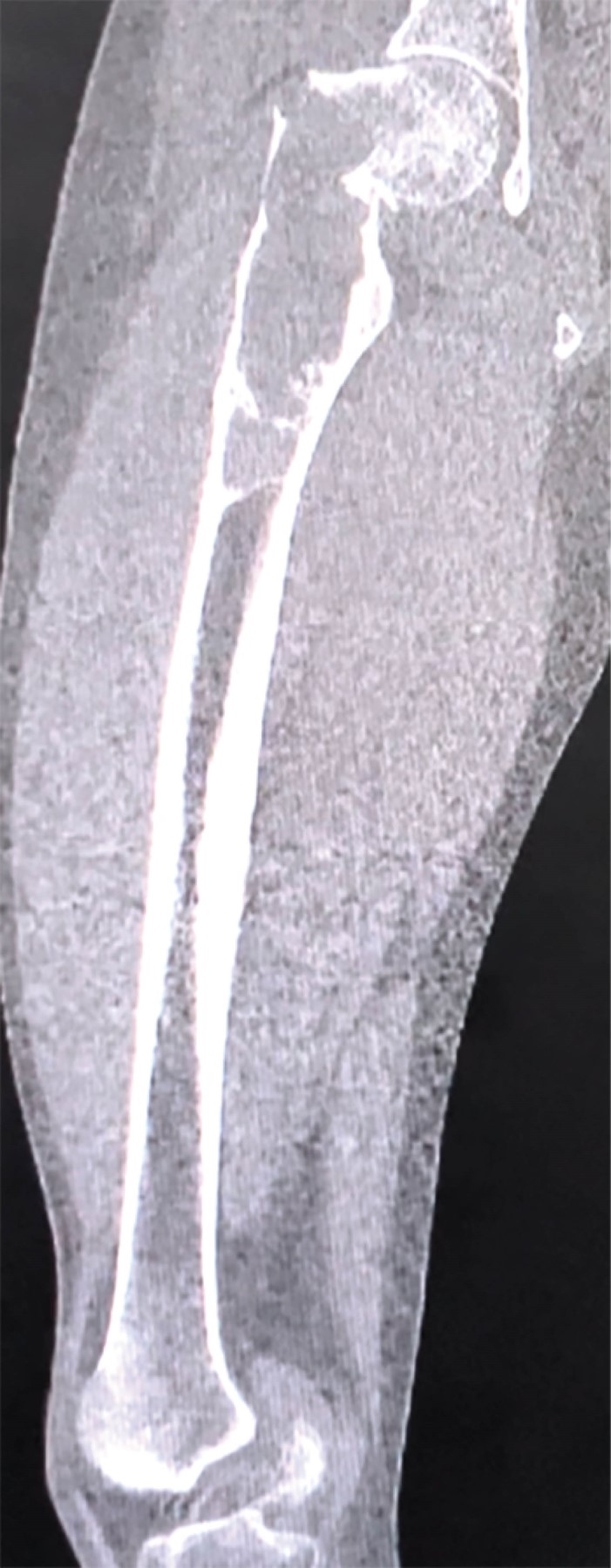 Se realizaron radiografías de pelvis y de fémur, que revelaron una fractura basicervical de fémur derecho Garden II Pauwells III AO 31B2.3r, con un patrón lítico de destrucción geográfica y un margen esclerótico bien delimitado que se extendía hacia el fémur distal aproximadamente 14 cm, sin evidencia de reacción endóstica o perióstica (Figura 1). Estas imágenes eran compatibles con una lesión de lento crecimiento, que necesitaba confirmación mediante histopatología, ya que, como se mencionó previamente, a pesar de que el paciente cuenta con antecedente de DF, existen otras entidades, algunas de comportamiento biológico maligno, de las cuales debe hacerse diagnóstico diferencial. Como estudio complementario, se realizó una tomografía simple de fémur derecho, ya que nos permite delimitar perfectamente los bordes de la tumoración para la planeación quirúrgica, así como precisar el patrón de destrucción lítico y el adelgazamiento del hueso cortical (Figura 2). Los parámetros del metabolismo óseo se encontraban dentro de valores normales.