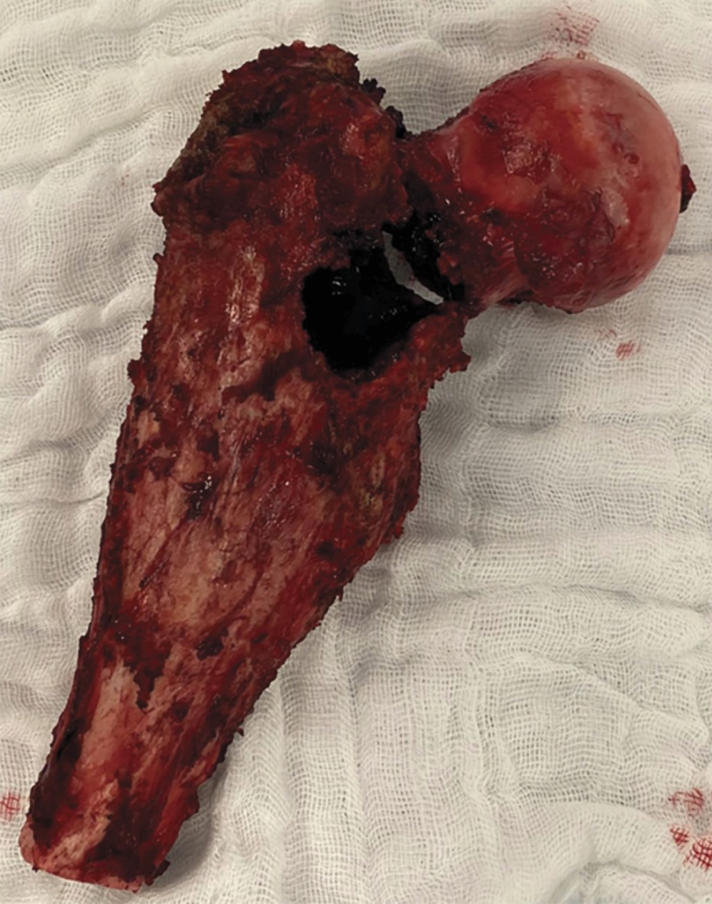 Se decidió llevar a cabo tratamiento quirúrgico, que consistió en una resección amplia de fémur proximal, artroplastía total con prótesis modular y biopsia escisional de fémur proximal derecho. Se realizó abordaje lateral directo. Se resecaron aproximadamente 14 cm de fémur proximal en forma de biopsia escisional para su estudio histopatológico (Figura 3), el cual confirmó la presencia de DF en el fémur proximal derecho.