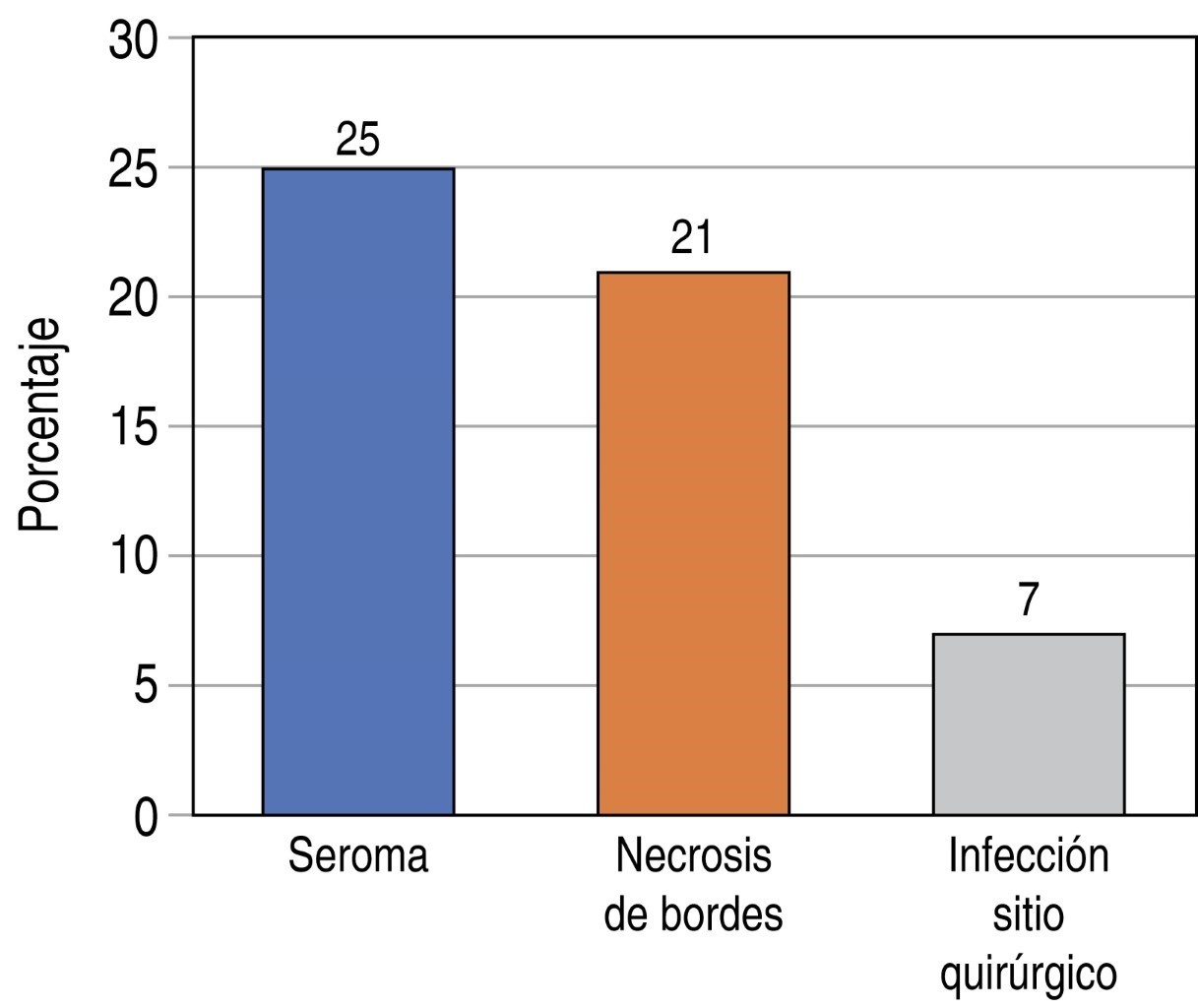 Respecto a las complicaciones posquirúrgicas, seis pacientes (21%) presentaron necrosis de los bordes quirúrgicos (1-2 mm, sin necesidad de tratamiento quirúrgico), siete (25%) desarrollaron seroma en la cicatriz umbilical (que requirió de drenaje y curaciones) y dos (7%) tuvieron infección de sitio quirúrgico (salida de material purulento, que requirió manejo con antibióticos y curaciones) (Figura 2).