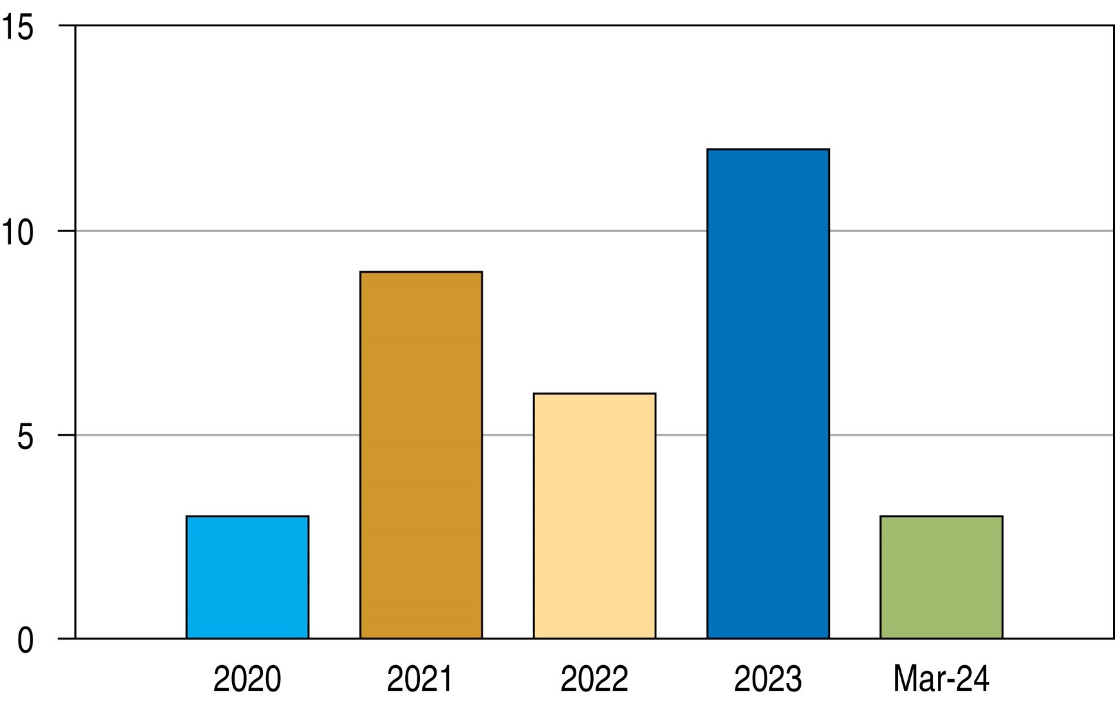 Se realizó la búsqueda de pacientes de enero de 2020 a marzo del 2024 y, después de aplicar los criterios de inclusión y exclusión, 33 pacientes fueron seleccionados para este estudio. La edad media de nuestros sujetos fue 42 años (rango 38-46.7) con una prevalencia absoluta en mujeres (87.9%) en comparación con los hombres. El tipo de disrupción de la vía biliar según la clasificación de Strasberg más frecuentemente encontrado fue el E3 (33.3%), seguido por el tipo E2 (27.3%). La técnica de reconstrucción utilizada en nuestro centro de referencia fue la hepaticoyeyunostomía Hepp-Couinaud. El momento de la reparación fue determinado desde el momento del diagnóstico de la disrupción hasta su intervención quirúrgica definitiva dividido en tres periodos; temprano, intermedio y tardío. Se encontró que la mayoría de nuestros pacientes fueron sometidos a la reparación quirúrgica en el periodo intermedio, entre una y seis semanas (66.7%). En el seguimiento postquirúrgico de nuestros pacientes que fue de seis meses en promedio, el 72.7% no presentó ninguna complicación y nueve de ellos (27.3%) sí presentaron. De éstos, el 12.1% desarrollaron fístula o fuga biliar, seguido de la estenosis (9.1%) y dehiscencia de la anastomosis (6.1%) (Tabla 1). El año que más casos de disrupción de vía biliar recibimos en nuestro centro de referencia fue el 2023, con un total de 12 pacientes, y hasta marzo de este año se presentaron tres casos (Figura 1). Cabe mencionar que todos los pacientes incluidos en este estudio fueron referidos de otra unidad.