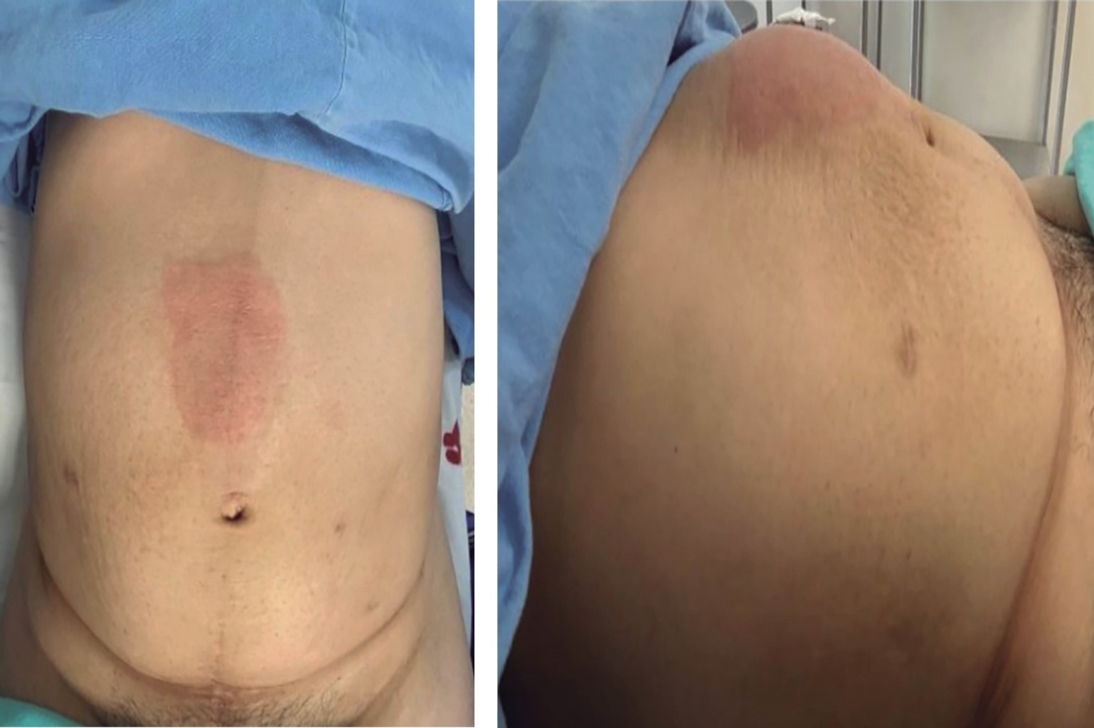 A la exploración física, paciente en buen estado general, signos vitales estables con tensión arterial 124/82 mmHg, frecuencia cardiaca 60 latidos por minuto, frecuencia respiratoria 18 respiraciones por minuto, temperatura 36.8 °C, neurológicamente íntegra, consciente, orientada, cooperadora, cardiorrespiratorio sin compromiso aparente. Abdomen que a la inspección presenta aumento de volumen sobre línea media con protrusión de 3 cm hacia exterior, 5 cm de ancho y 10 cm de largo; además, se visualiza aumento de volumen en región umbilical de 1 cm de diámetro (Figura 1).