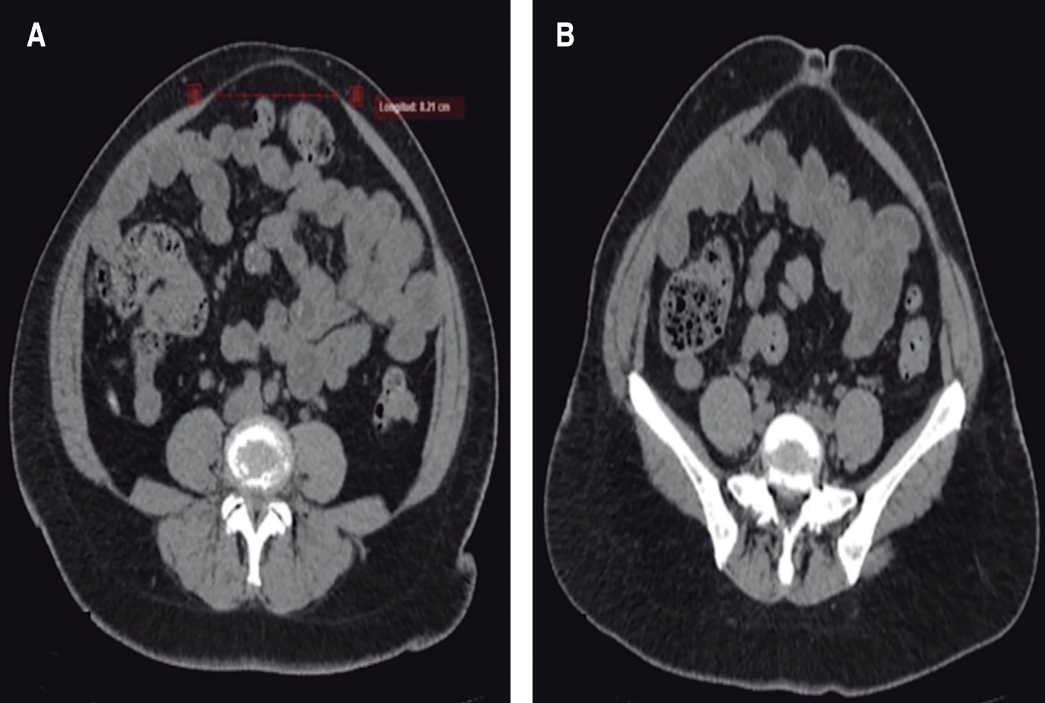 Tras la inspección, se solicita TC de abdomen, la cual se realiza el 03.01.2023, reportando, a nivel supraumbilical, umbilical y justo por debajo de cicatriz umbilical, separación de músculos rectos abdominales de hasta 8.21 cm, fascia abdominal anterior integra, excepto en región umbilical en donde se observa una solución de continuidad de 9.6 mm, con formación de saco herniario de 7.5 × 1.75 mm de contenido epiploico. Se clasifica cómo una diástasis de rectos severa (Figura 2).