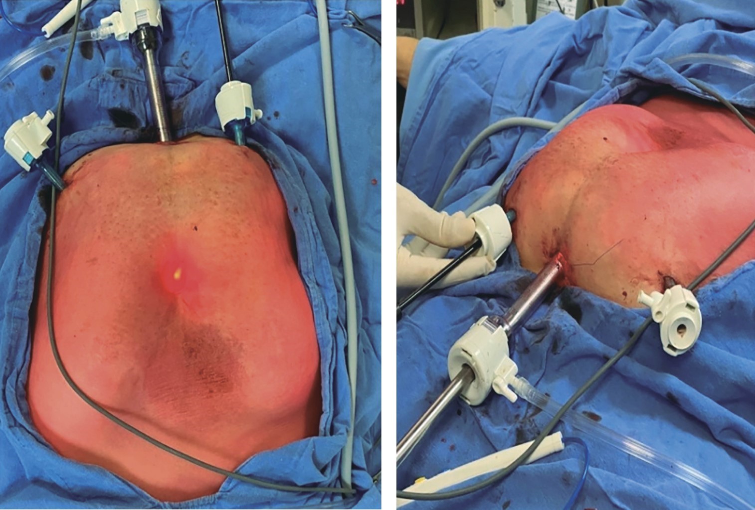 Se realiza protocolo quirúrgico completo, laboratorios dentro de parámetros normales, por parte de anestesiología se otorga ASA III por descontrol metabólico y riesgo anestésico E3B. El día 23.02.2023 se decide efectuar reparación endoscópica preaponeurótica (REPA); se realiza plastía umbilical con plicatura de rectos y colocación de malla de polipropileno onlay, sin prehabilitar al paciente antes del procedimiento. Con la paciente bajo anestesia general, previa asepsia y antisepsia de la región, la técnica quirúrgica consistió en incisión suprapúbica de aproximadamente 2 cm; bajo visión directa, se diseca tejido celular subcutáneo a nivel de fascia de Scarpa hacia ambas fosas iliacas y visualizando fascia preaponeurótica. Posteriormente, se coloca trócar de 10 mm y se fija con jareta a piel, bajo visión directa se colocan dos puertos más hacia ambas fosas iliacas de 5 mm (Figura 3).