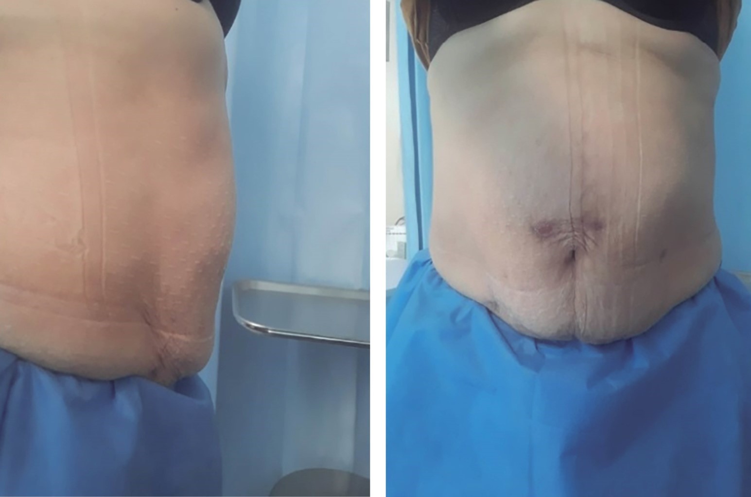 Durante el acto quirúrgico, la paciente se presenta clínicamente estable; secundario a antecedente de cesáreas previas presentó abundante tejido cicatrizal a nivel infraumbilical sobre línea media. Hallazgo de diástasis de rectos de 7 cm, hernia umbilical de 2 cm, saco herniario de 2 cm. La paciente se mantiene un día en vigilancia con manejo analgésico; después es egresada y continúa su seguimiento por consulta externa. A los dos meses, la paciente se refiere asintomática, a la exploración física no se palpa defecto herniario ni diástasis de rectos, con buenos resultados estéticos (Figura 6).