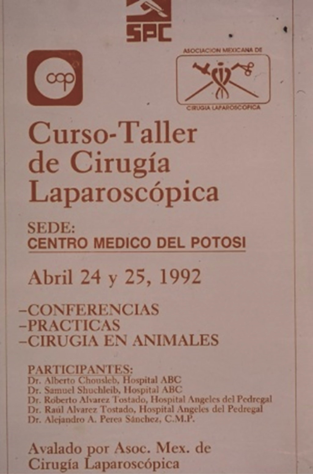 El inicio de un país con visión comercial y de negocios favoreció el desarrollo de la industria y por ende el tipo de enfermedades laborales y los accidentes, propios de una sociedad industrial.13 Durante los años 90, en nuestro estado, se dio un nuevo impulso a la industria, lo que motivó un cambio en el tipo de enfermedades quirúrgicas que se dieron. En el análisis de Navarro Sánchez del Hospital Central "Dr. Ignacio Morones Prieto" se describe que de las 10 enfermedades atendidas con más frecuencia, las que tuvieron que ver con procedimientos quirúrgicos fueron: hernias con obstrucción intestinal y colecistitis en 1971;14 ese primer dato nos sirve para comentar que estas estadísticas se mantuvieron vigentes, añadiéndose otras patologías, como apendicitis aguda y hernias de pared abdominal, para el periodo de 1980-1990. Dos aspectos relevantes en esta era fueron el inicio de la laparoscopia, cuyo primer procedimiento lo realizó el Dr. Leopoldo Gutiérrez en junio de 1990 en la Ciudad de México y posteriormente, bajo la asesoría del Dr. Jorge Pérez Castro y Vázquez, los Dres. Alejandro A. Perea Sánchez y John Peterson Andrews realizan las primeras cuatro colecistectomías laparoscópicas en nuestro estado.13 Para 2023 se realizan al menos ocho en medio institucional y 11 en medio particular por día. Es importante destacar el primer curso-taller de cirugía laparoscópica, realizado el 24 y 25 de abril de 1992 en el entonces Hospital Centro Médico del Potosí, con práctica en animales; se muestra el cartel en la Figura 2. El segundo evento trascendente fue el inicio de los trasplantes en 1987, de los cuales se han constituido en 2023, siendo realizados principalmente en el Hospital Central "Dr. Ignacio Morones Prieta", Hospital Lomas de San Luis y el Hospital General de Zona No. 50 del IMSS.