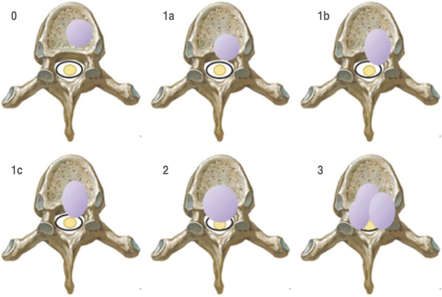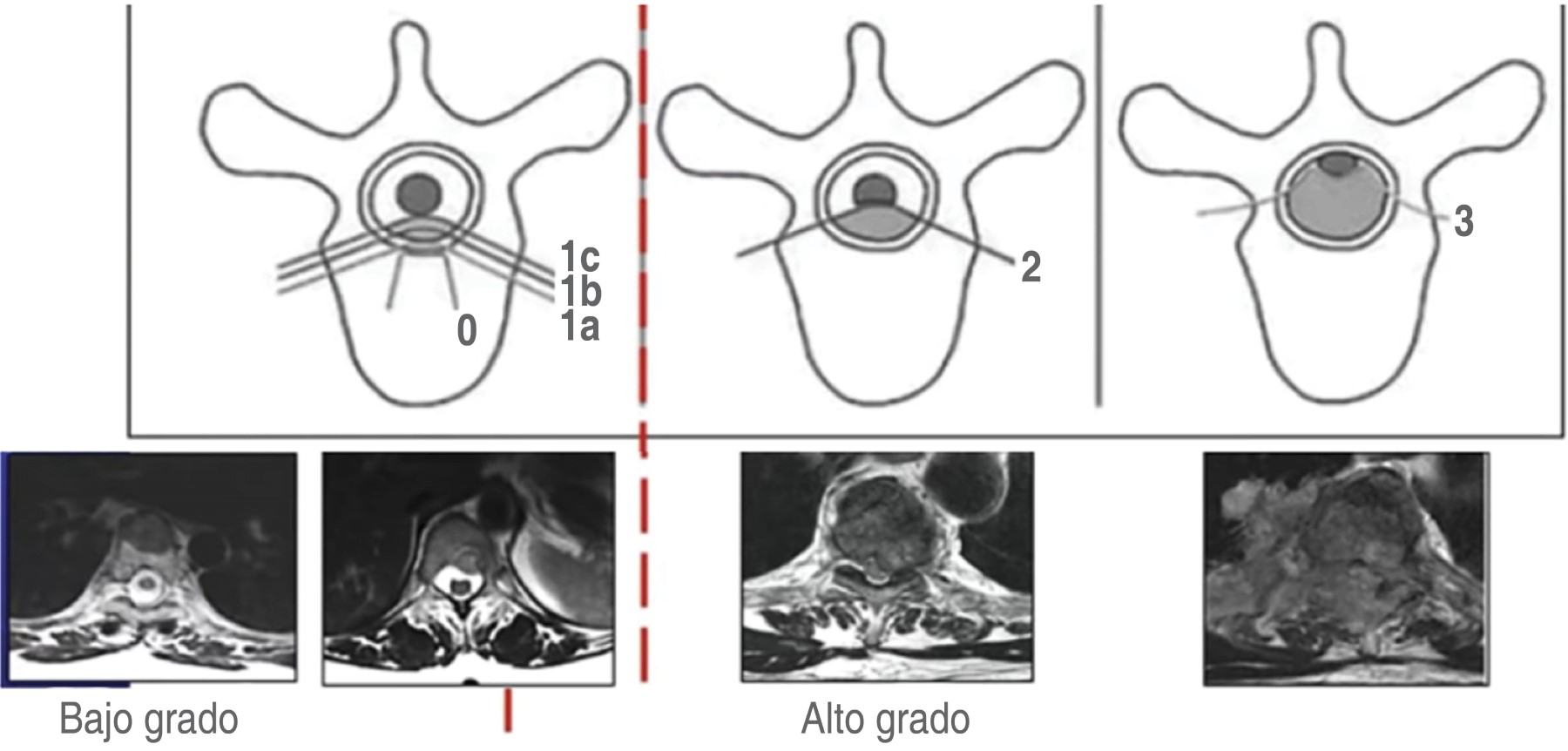 - • 1: invasión del espacio epidural (a: no deforma el saco dural, b: deforma el saco dural, c: contacta con la médula, pero no la comprime);
