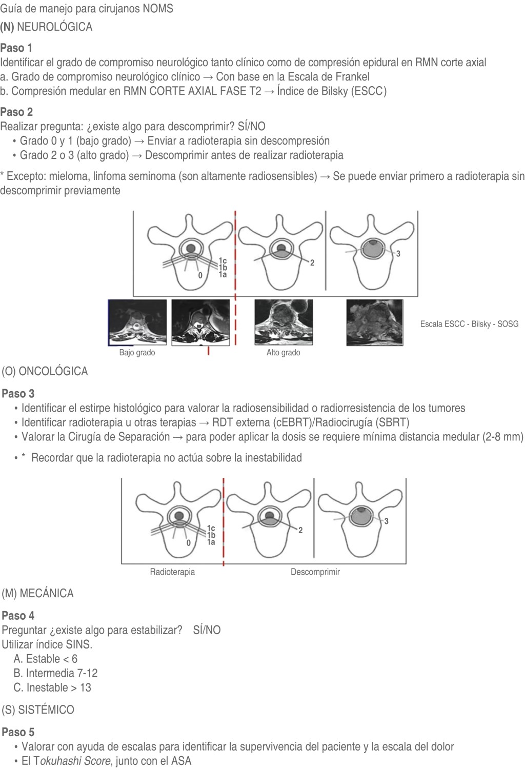 En la evaluación, categorización y definición de una conducta terapéutica para tratar a los pacientes con metástasis vertebrales, nosotros hemos incorporado el marco de decisión neurológica, oncológica, mecánica y sistémica (Neurologic, Oncologic, Mechanical, and Systemic, NOMS, en inglés) (Tabla 1).2