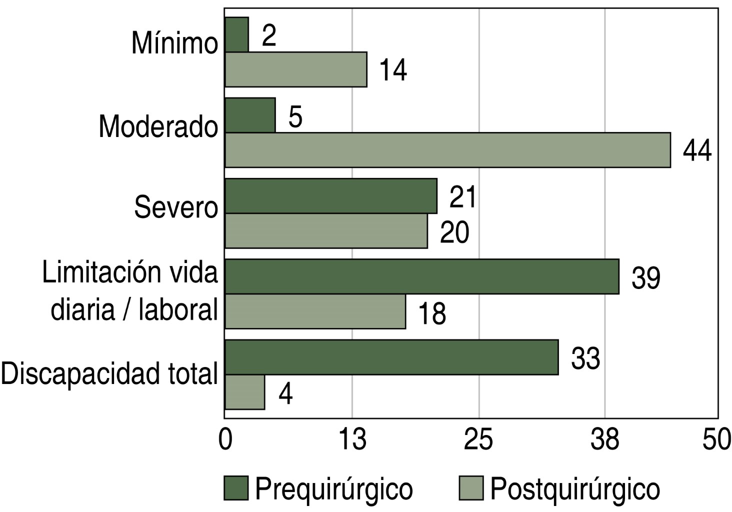 Previamente a la cirugía, el grado de limitación funcional evaluado por el cuestionario de Oswestry mostró una limitación significativa para la vida diaria y laboral en el 39% (n = 26) de los pacientes, seguido de discapacidad total en 33% (n = 22), discapacidad severa en 21% (n = 14), discapacidad moderada en 5% (n = 3), y mínima en 2% (n = 1).