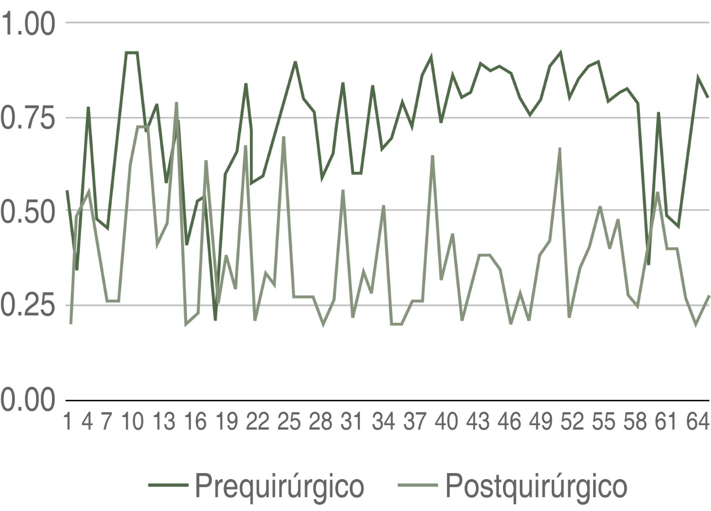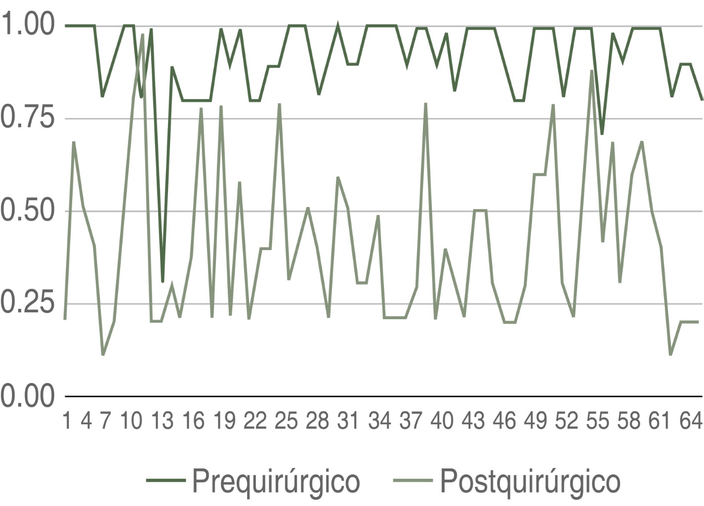 El rango de puntuaciones porcentuales obtenidas tras la aplicación de cuestionario Oswestry va desde el 20 hasta un 92% previo a la intervención, con una media de 72 ± 16%, teniendo un diferencial medio de –28% ± 20, un amplio margen de diferencia entre dichas puntuaciones y obteniendo una media postquirúrgica 44%, cuyo rango fue 20 al 81% (Figura 3).