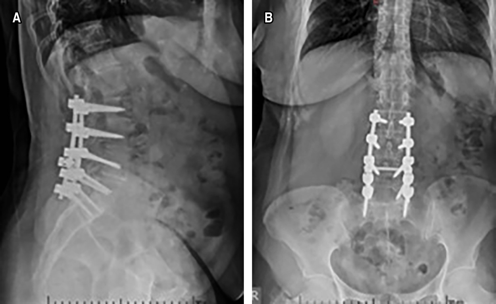Se recabó información de un total de 40 pacientes con diagnóstico de CLE degenerativo, que fueron sometidos a recalibraje, ligamentoplastía y artrodesis posterolateral con instrumentación con tornillos y barras (Figuras 1 y 2). Los niveles instrumentados más frecuentes fueron L3-L5 en 35% y L5-S1 en 10%. La distribución por sexo fue 57.5% (n = 23) mujeres y 42.5% (n = 17) hombres. El rango de edad fue de 45-76 años, con promedio de 65 años. Las tres ocupaciones más frecuentes fueron: docente (25%), ama de casa (17.5%), policía (10%). En cuanto a los síntomas previos a la cirugía existieron 32 (80%) pacientes que referían una intensidad del dolor lumbar de 7/10 y ocho (20%) casos con 8/10 en la escala numérica del dolor. Referente a la fuerza de las extremidades pélvicas hubo 26 pacientes (65%) con 4/5 en la escala de Daniels, y seis casos (15%) que referían parestesias en ambas piernas. En los datos obtenidos seis meses posteriores a la cirugía, se observó que 85% de los pacientes refirieron un dolor de intensidad 3/10 y 15% intensidad 4/10. Los 26 pacientes con fuerza 4/5 mejoraron a 5/5 en la escala de Daniels. Cinco de los seis pacientes que tenían parestesias, mencionaron que estas desaparecieron (Tabla 1). El índice de discapacidad de Oswestry previo al evento quirúrgico fue de 42% en promedio, de 25% a los seis meses y de 18% a los 12 meses posterior a la cirugía.