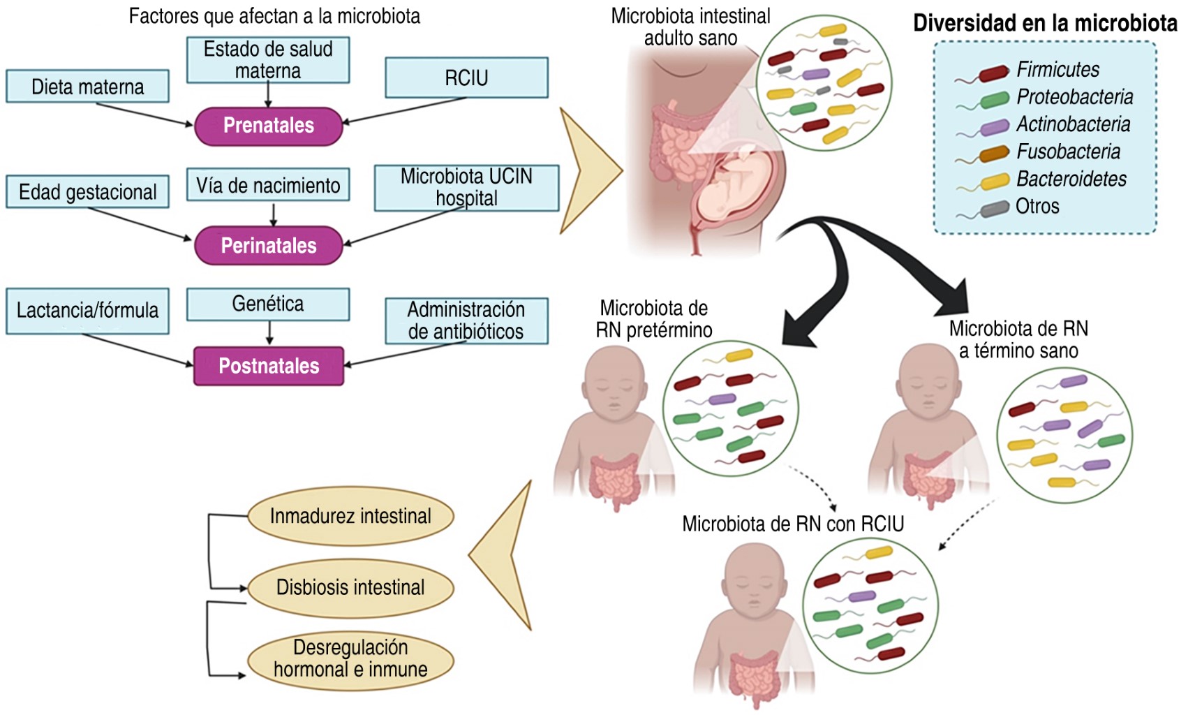 La microbiota intestinal, compuesta por microorganismos naturales del tracto gastrointestinal, facilita la digestión, fortalece el sistema inmunológico y regula el metabolismo. La colonización de la microbiota intestinal del recién nacido (RN) es un proceso complejo influenciado por múltiples factores, incluida la edad gestacional, el modo de parto, la estrategia de alimentación y las intervenciones médicas.1 Las alteraciones en la microbiota intestinal se han relacionado con alteraciones en la absorción de nutrientes, así como con el crecimiento y el desarrollo neurológico.2 En el contexto de la restricción del crecimiento intrauterino (RCIU), el nacimiento prematuro añade un nivel de complejidad. Los recién nacidos prematuros (RNP) con restricción del crecimiento intrauterino enfrentan elevadas tasas de morbilidad y mortalidad, así como implicaciones para la salud a largo plazo, incluyendo alteraciones del neurodesarrollo y trastornos cardiometabólicos, los cuales se han relacionado con la microbiota intestinal.3
