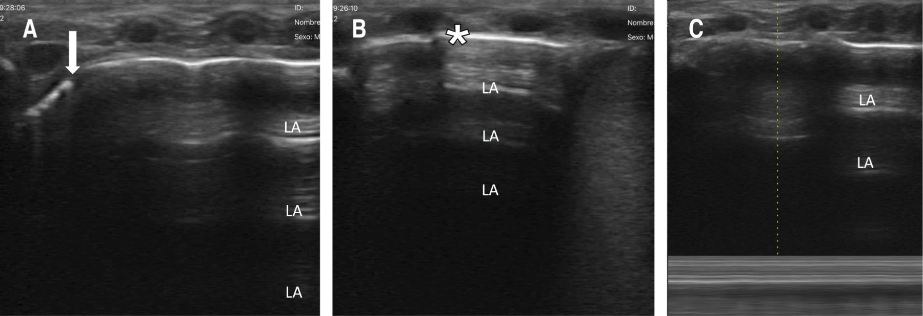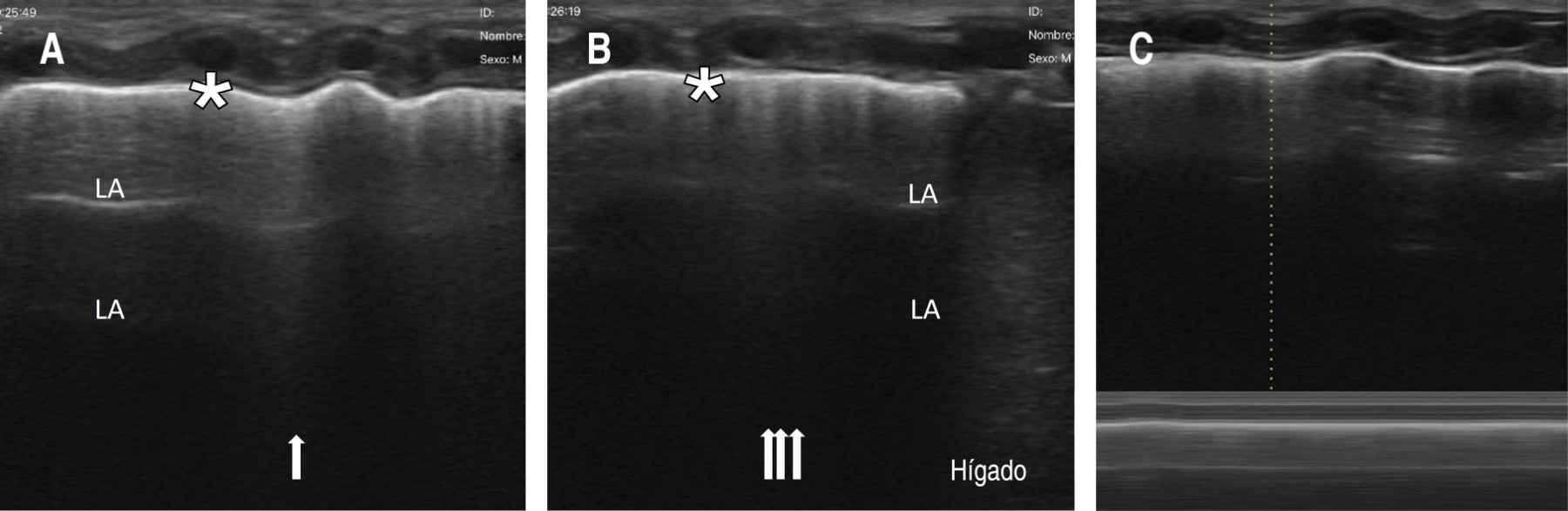 Se ha descrito que el UP tiene mayor sensibilidad que la placa de tórax para el diagnóstico de neumotórax, para lo cual se han establecido diferentes criterios para su identificación: 1) desaparición del deslizamiento pleural, 2) patrón de líneas-A con ausencia de líneas-B (una sola línea-B, descarta el diagnóstico), 3) signo del "código de barras" en el modo-M y 4) ausencia de "pulso de pulmón" (transmisión de los latidos cardiacos a la línea pleural). Cuando se observa el "punto pulmonar", que es la identificación del punto de transición entre un área no deslizante y otra deslizante, se relaciona altamente con la presencia de neumotórax, pero es importante señalar que no se llega a observar cuando existe neumotórax a tensión.1 En nuestro paciente representa la transición entre el ápice deslizante con la región medial y basal no deslizantes.