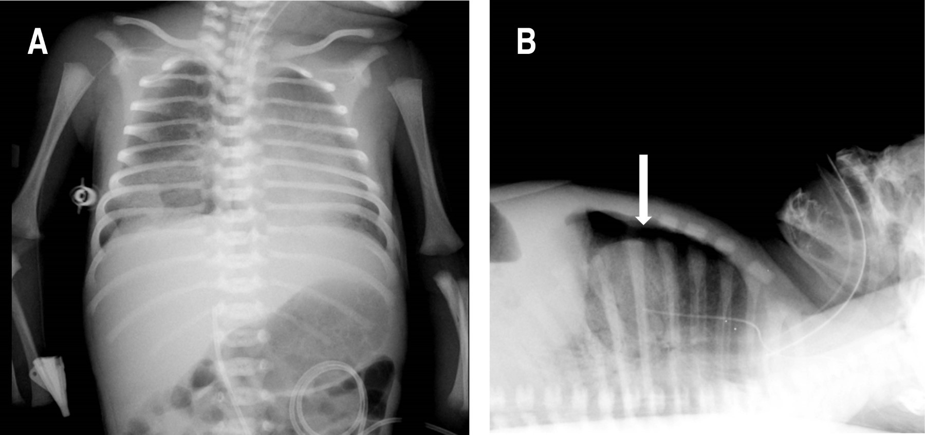 A los 10 minutos de vida inicia con dificultad respiratoria requiriendo CPAP nasal y, posteriormente, ventilación mecánica. Se integra diagnóstico de sepsis neonatal temprana y se inicia cobertura antibiótica. Al tercer día de vida, de manera súbita presenta deterioro respiratorio, por lo que se incrementan las variables ventilatorias para mantener saturaciones objetivo.