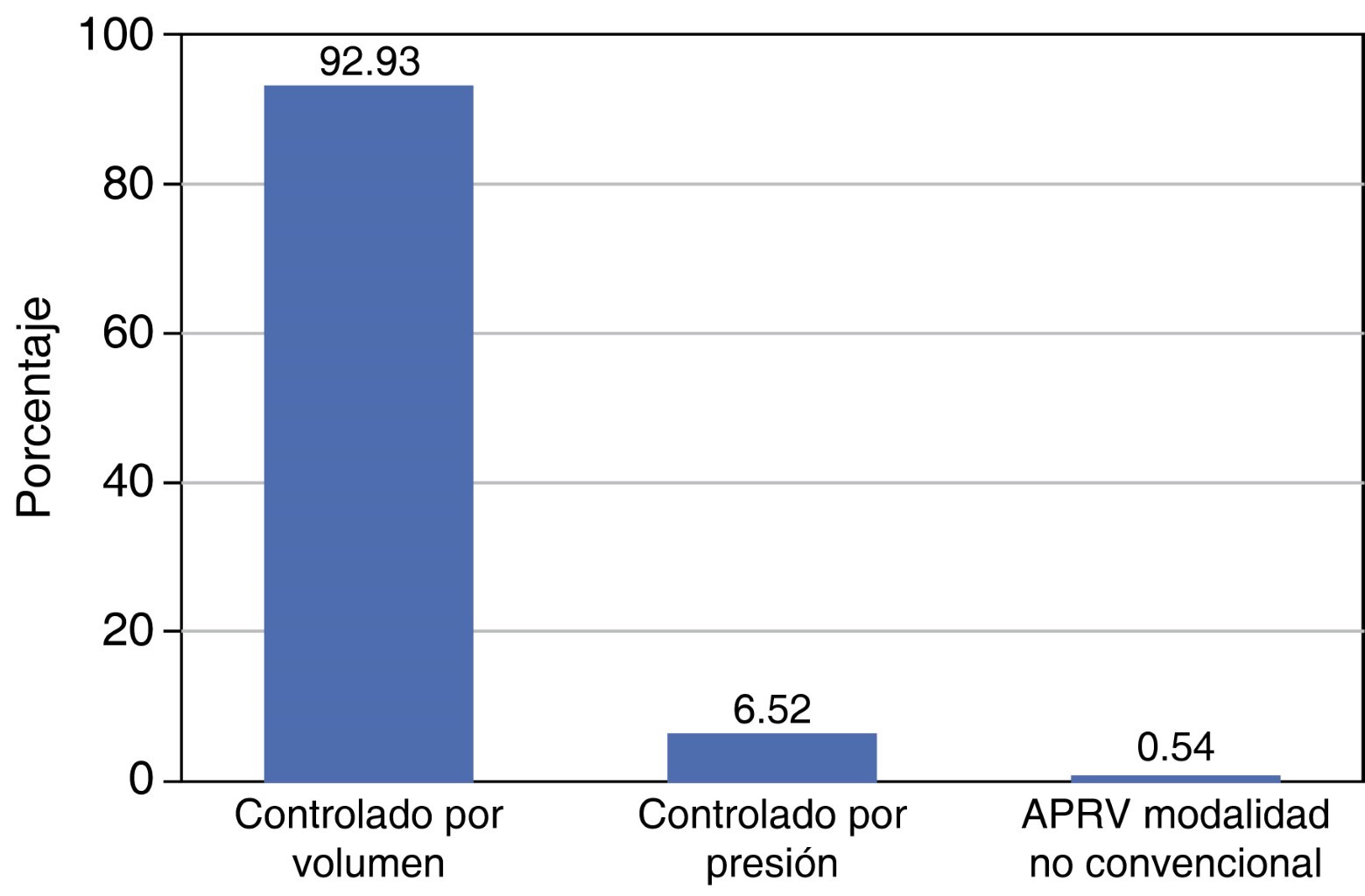 Parámetros ventilatorios: durante el manejo de paciente con SDRA secundario a infección por SARS-CoV-2 en ventilación mecánica, se observó que la modalidad más utilizada fue la controlada por volumen (ACV) en 171 (92.9%) pacientes, le siguió la modalidad controlada por presión (ACP) en 12 (6.5%) y, por último, la modalidad ventilación con liberación de presión de las vías respiratorias (APRV) en un paciente (0.5%) (Tabla 2).