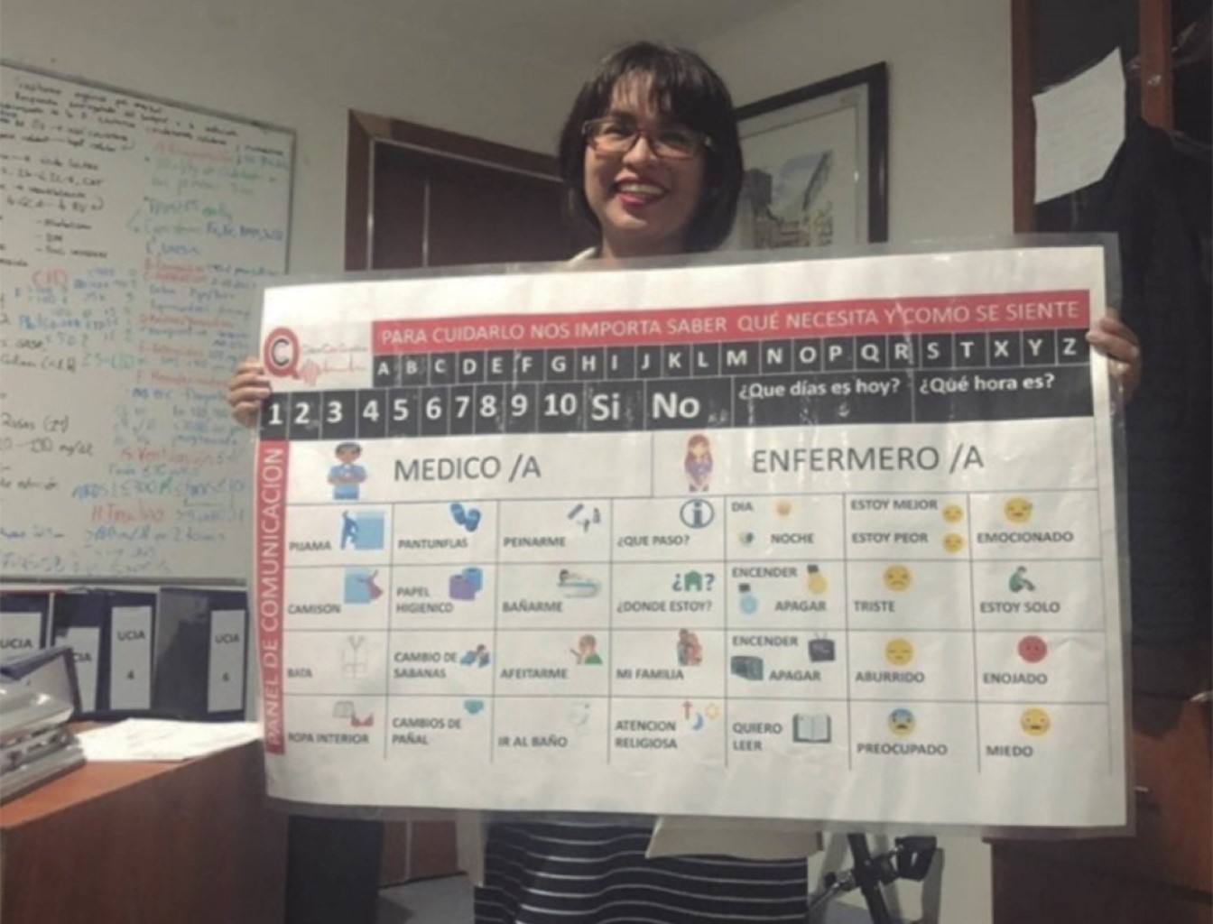 La protocolización de la comunicación con pacientes con barreras del lenguaje mediante herramientas de comunicación aumentativas y alternativas es vital para el éxito de la atención en pacientes críticos. Muchos de los pacientes en UCI presentan barreras para la comunicación, sean resultado del uso de dispositivos de ventilación mecánica, alteraciones estructurales, barreras físicas, o el simple hecho de no compartir un idioma en común; la adopción de herramientas convencionales como el tablero comunicador expuesto en la Figura 3, o herramientas electrónicas como la aplicación Patient Communicator de la Society of Critical Care Medicine, han mostrado ser de utilidad.6,7