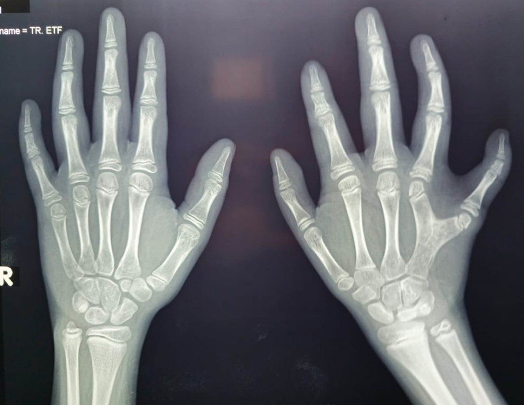 Valoración radiológica: resonancia magnética con secuencias en T1, T2 y FLAIR en planos axial, sagital y coronal, identificando lo siguiente: pérdida de volumen cerebral supratentorial-cortical, en la fosa posterior se observan lesiones extraaxiales, de morfología ovoidea de bordes regulares y bien definidos, hiperintensas en el T2 e hipointensas en el T1 imágenes que sugieren quistes aracnoideos adyacentes al borde posterior de ambos lóbulos cerebelosos, los cuales presentan ligero desplazamiento en sentido anterior e hipoplasia de cuerpo calloso (Figura 2). Radiografías de manos anteroposterior y oblicua que muestran densidad ósea y el estado de mineralización acordes a la edad del paciente, placas de crecimiento acordes con su edad, mano izquierda: se identifica fusión de 4-5 metacarpiano en el tercio proximal y medial, lo que condiciona un desplazamiento en sentido lateral del quinto metacarpiano y medial del cuarto, lo que lleva la pérdida de la morfología habitual de las articulaciones metacarpofalángicas -más evidente en el quinto dedo- con una aparente subluxación con disminución de las dimensiones de los extremos distales de las superficies articulares de los metacarpianos, hay disminución del tamaño, los huesos del carpo más evidente en escafoides izquierdo con disminución en su eje transverso, ausencia de la apófisis estiloides del cúbito izquierdo (Figura 3). Morfología del extremo articular de radio izquierdo presenta un aumento en su eje cefalocaudal, se observa una disminución del espacio articular del semilunar con el piramidal sin descartar la posibilidad de una fusión, asociado a esto hay una disminución de la densidad del piciforme. Radiografías de tórax muestran prominencia del reborde lateral derecho de la silueta cardiaca.