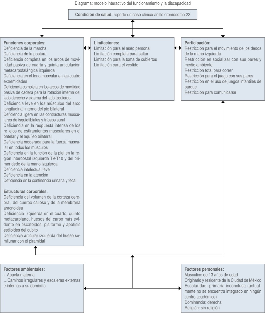 Introducción: el anillo del cromosoma 22 es un rearreglo estructural genético raro, se han reportado pocos casos. Objetivo: ofrecer un tratamiento rehabilitatorio basado en la CIF (Clasificación Internacional de la Funcionalidad) y contribuir con el fenotipo clínico del paciente con características no descritas previamente, como la fusión de 4-5 metacarpiano y la ausencia de la apófisis estiloides de cúbito izquierdo. Presentación del caso: se presenta paciente masculino con síndrome del anillo del cromosoma 22, cuyo fenotipo clínico se traslapa con el síndrome de Phelan-McDermid o síndrome de deleción del cromosoma 22q13.3, el paciente presenta discapacidad musculoesquelética e intelectual. El tratamiento rehabilitatorio está basado en una medicina de precisión y se aplicó la metodología de la CIF. Resultados: se identificaron las deficiencias en sus funciones corporales y en las estructuras corporales, las limitaciones, las restricciones en la participación, los factores personales y ambientales y se diseñaron programas de terapia física y ocupacional para reeducar la marcha, el fortalecimiento muscular de tren inferior y se entrenó en actividades básicas de la vida diaria en higiene personal, vestido y alimentación. Conclusiones: se diseñó un tratamiento rehabilitatorio personalizado que brindó mejor autonomía y calidad de vida al paciente.INTRODUCCIóN