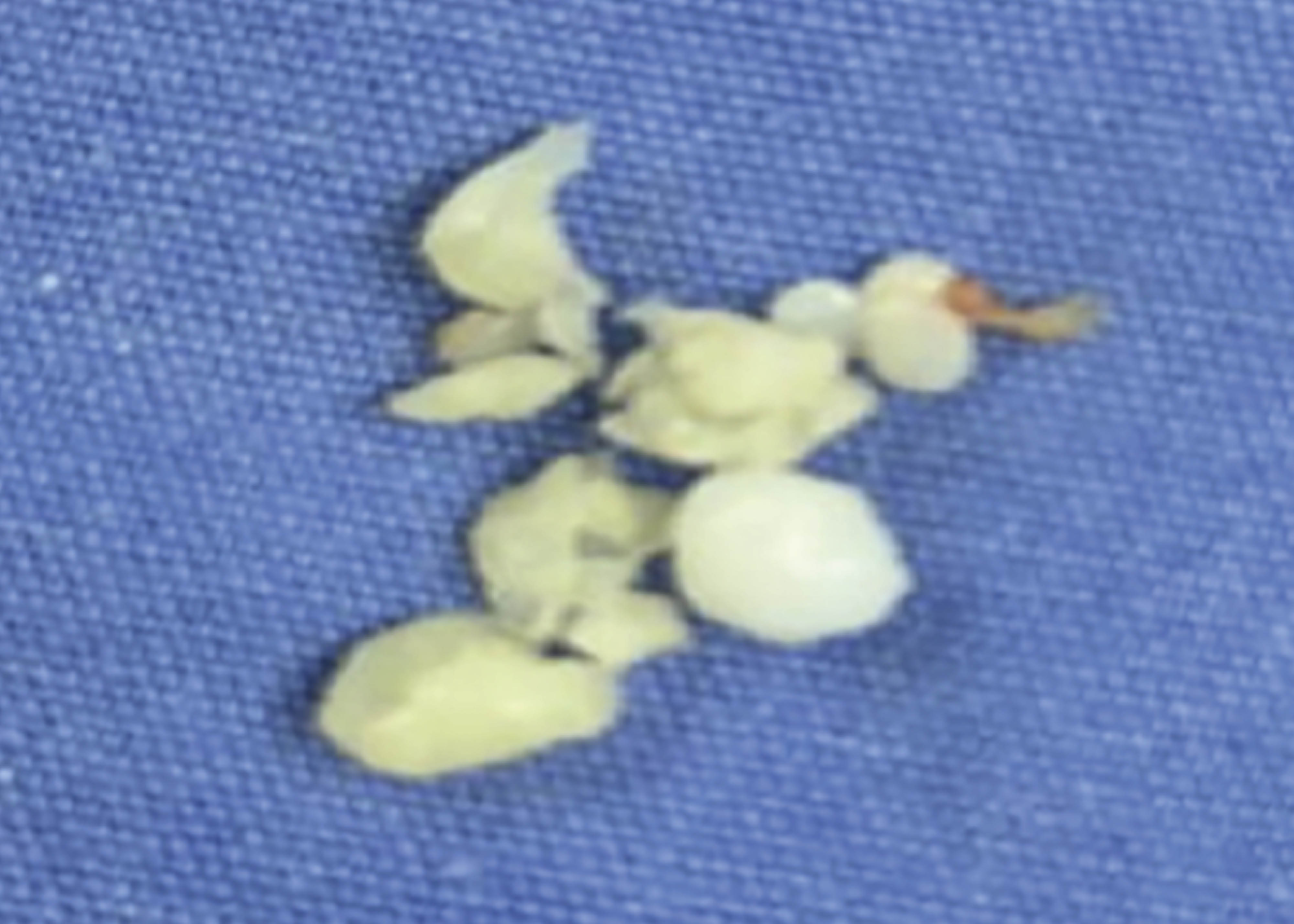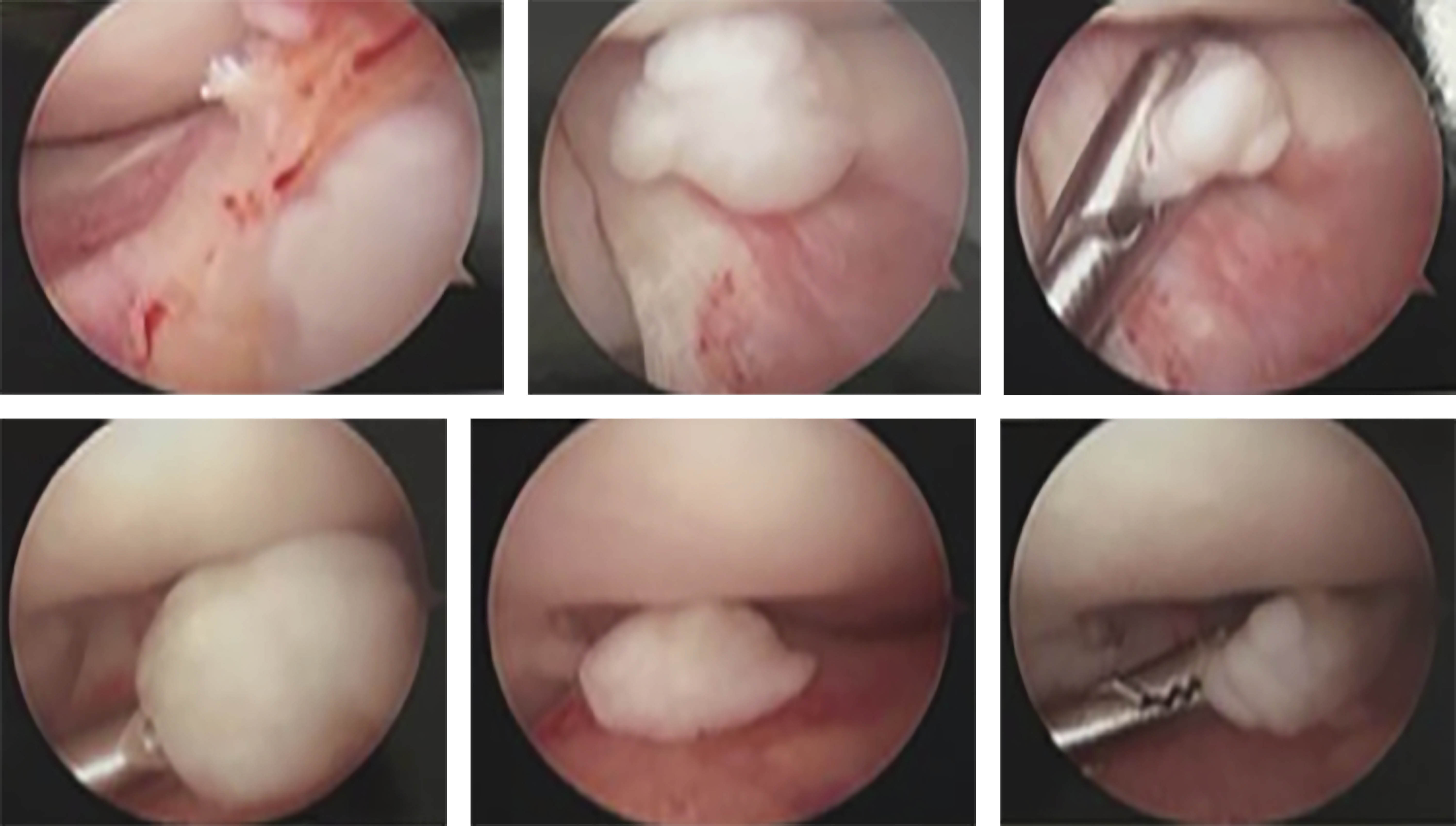 Masculino de 54 años, que consulta por dolor, bloqueos al momento de flexionar y extender la rodilla izquierda de dos años de evolución sin antecedentes de trauma. Se evalúa marcha dolorosa acompañado de edema y dolor en rodilla izquierda. La resolución del caso se realizó mediante cirugía: artroscopia de rodilla con resección completa de la condromatosis sinovial (Figuras 1, 2 y 3).