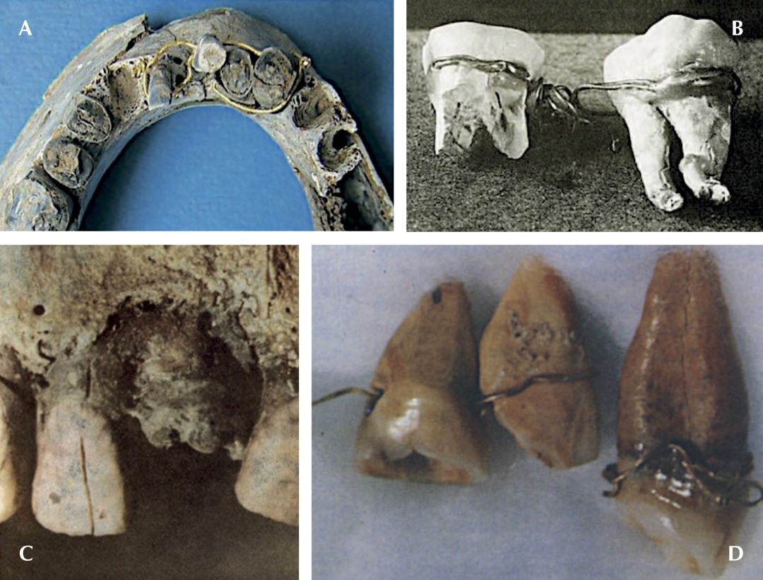 De los llamados "aparatos protésicos" que se han documentado en el antiguo Egipto, el ejemplo más conocido consiste de un segundo molar mandibular conectado mediante un alambre de oro a un tercer molar desgastado (Figura 2). Fue descubierto en una mastaba de Giza en 1914, cerca de la actual ciudad del Cairo, que data de más de 4,500 años y, lo que es más importante, no se encontró adherido a un cráneo. El informe dental afirmaba que, a juzgar por el color y la forma anatómica de los dientes, pertenecían a la misma persona. Además, como las raíces del tercer molar presentaban extensa resorción, debido a un probable proceso inflamatorio crónico, el diente se había vuelto móvil y, en un intento de estabilizarlo, fue alambrado al diente vecino. Otro trabajo protésico es el de otra mastaba de la cuarta dinastía en El-Quatta encontrado en 1952 cerca de el Cairo, donde se aprecia que el aparato protésico era demasiado débil para soportar las grandes fuerzas de la masticación. También se concluye que este puente fue añadido al cuerpo durante el proceso de momificación. Un tercer aparato protésico, el de Tura el-Asmant, fue de una sola unidad para amarrar un incisivo superior con probable avulsión (Figura 2C). Estas tres muestras de aparatos protésicos son fijaciones de dientes con alambre de oro que han sido supuestos como tratamiento, y al menos dos de ellos probablemente fueron aplicados postmortem como preparación para la otra vida. Existe un consenso en la literatura sobre la mínima intención para realizar extracciones en el antiguo Egipto.
