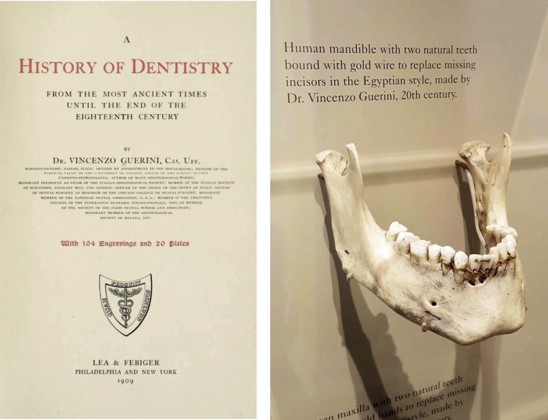 En las redes sociales y en cientos de publicaciones compartidas se muestran fotos de dientes unidos con alambre de oro, afirmando que representan "un trabajo dental del antiguo Egipto del año 2000 a.C. hallado en Fayum". Pero en realidad esa información es falsa. De hecho, El Museo Nacional de Odontología Dr. Samuel D. Harris de la Universidad de Maryland en Baltimore expone un modelo hecho por Guerini, un dentista italiano en los inicios del siglo XX. Vincenzo Guerini (1859-1955) supuestamente estaba inspirado en algunas descripciones de arreglos protésicos en momias egipcias, y trató de describir los procedimientos en su libro de 1909 "Una historia de la odontología desde los tiempos más antiguos hasta finales del siglo XVIII" (Figura 4). Pero no se sabe si el Dr. Guerini vio realmente una momia egipcia con este tipo de prótesis dental, ya que actualmente no se conoce a ninguna momia del antiguo Egipto con ese procedimiento protésico, sólo se conocen los "puentes de Ford y Gaillardot" descubiertos en 1901 durante las excavaciones en las tumbas rupestres fenicias ubicadas cerca de la antigua Sidón (Figura 2A). En realidad, el modelo de Guerini no representa a la antigua odontología egipcia. Por lo tanto, esa afirmación se considera falsa. Una búsqueda inversa de imágenes encontró varias fotos en un artículo de la revista Forbes que desmintió varias afirmaciones sobre "esqueletos antiguos".