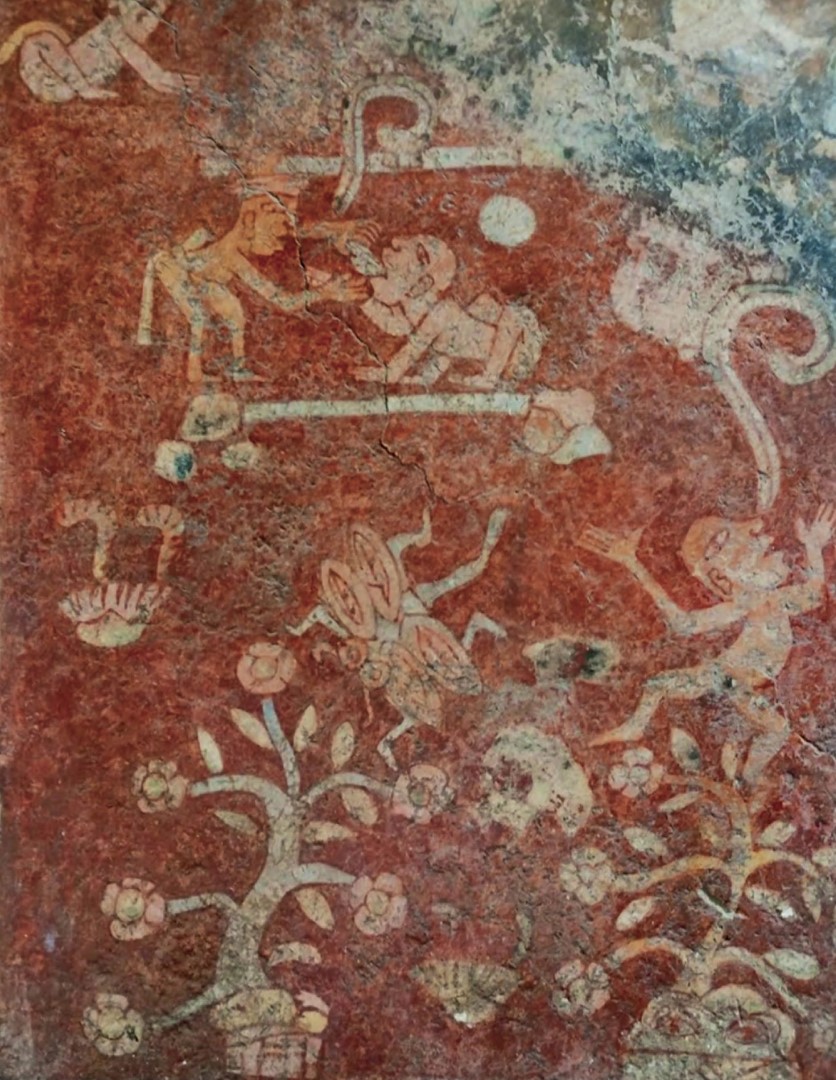 No pasó mucho tiempo cuando ya estaba frente a aquel impresionante mural alusivo a la cosmovisión de la sociedad teotihuacana donde destacaba el borroso mural del Tláloc Rojo; El Tlalocan o paraíso de Tláloc con una procesión de sacerdotes-guerreros realizando diversas acciones ceremoniales o cotidianas. Y fue ahí mirando hacia abajo del mural, bajo uno de los glifos se encontraba la famosa imagen de la "extracción maya" (Figura 6).