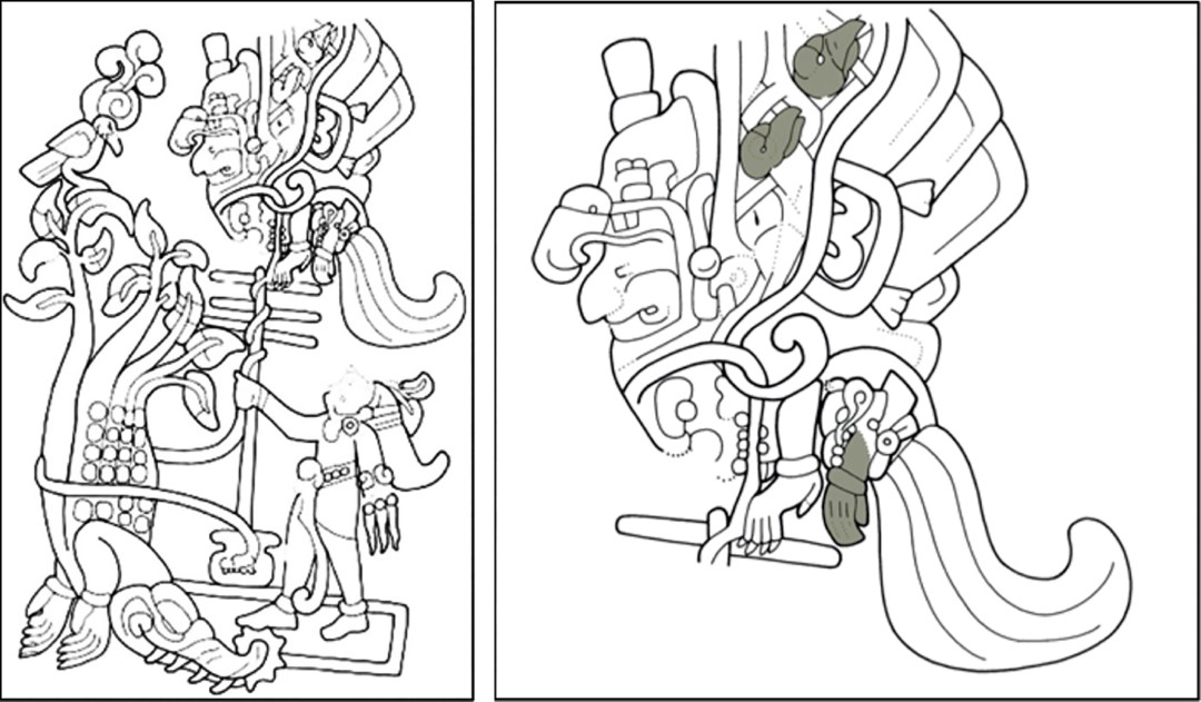 En la descripción de este mito, resulta imposible que el ave pudiese cortar un brazo, ya que al caer del árbol tiene los dientes flojos y la mandíbula disfuncional. Además, huye sosteniendo su quijada con las manos mientras carga el brazo cortado de Hunahpú. En el texto maya quiché, la palabra X-cupix4 se traduce al español como "cortar tela, madera o carne"; estas actividades se realizan comúnmente con un instrumento filoso, y para cortar hueso se requiere una gran presión y fuerza, de las cuales el ave carecía. La respuesta a esta incongruencia la tenemos en la estela 25 de Izapa, Chiapas (Figura 1), donde se observa un cocodrilo extendido de forma vertical, como si colgara de su cola, con las fauces dirigidas al suelo. Su dorso escamoso, sus patas traseras y cola, forman el tronco y las ramas de un árbol cocodrilo donde se posa un ave celeste (lado izquierdo del lector), mirando de frente a Vucub Caquix (ángulo superior derecho).5