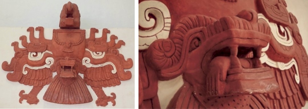 El cuerpo de Vucub Caquix está circundado por una serpiente que baja enredándose en un poste sostenido por Hunahpú, quien aparece sin su brazo izquierdo, y en su lugar se aprecian gotas de sangre (símbolo trifoliado). En la parte horizontal del poste, el ave se sostiene con su mano, y en su vientre se observa lo que corresponde a la vagina dentada, portando el brazo cortado de Hunahpú. Otra representación, más clara y contundente se encuentra en el juego de pelota en Copán, Honduras, donde se aprecia al ave, sosteniendo entre sus mandíbulas serpentinas y vaginales el brazo cercenado de Hunahpú (Figura 2).